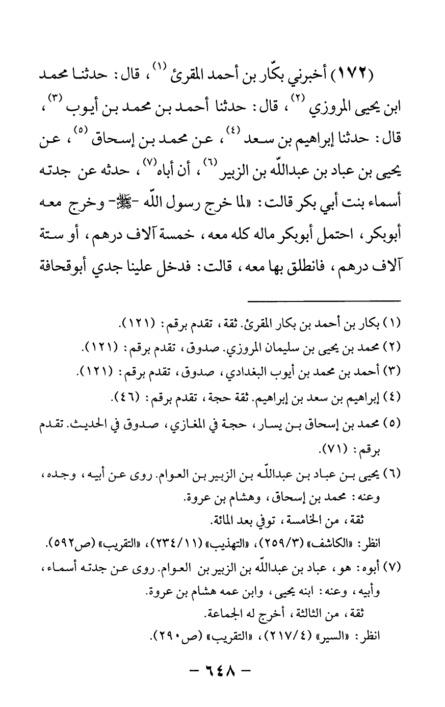172 - أخبرني بكار بن أحمد المقرئ قال: حدثنا محمد بن يحيى المروزي قال: حدثنا أحمد بن محمد بن أيوب قال: حدثنا إبراهيم بن سعد عن محمد بن إسحاق عن يحيى بن عباد بن عبدالله بن الزبير أنا أباه حدثه عن جدته أسماء بنت أبي بكر رضي الله عنها قالت لما خرج رسول الله صلى الله عليه وسلم وخرج معه أبو بكر احتمل أبو بكر ماله كله معه خمسة آلاف درهم أو ستة آلاف درهم فانطلق بها معه قالت فدخل علينا جدي أبو قحافة -[649]- وقد ذهب بصره فقال والله إني لا أراه قد فجعكم بماله مع نفسه قالت قلت كلا يا أبت قد ترك له خيرا كثيرا قالت وأخذت أحجارا فوضعتها في كوة في البيت كان أبي يضع فيها ماله ثم وضعت عليها ثوبا ثم أخذت بيده فقلت ضع يا أبت يدك على هذا المال فوضع يده فقال لا بأس إذا كان ترك لكم هذا فقد أحسن وفي هذا لكم بلاغ قالت ولا والله ما ترك لنا شيئا ولكن أردت أن أسكن الشيخ بذلك