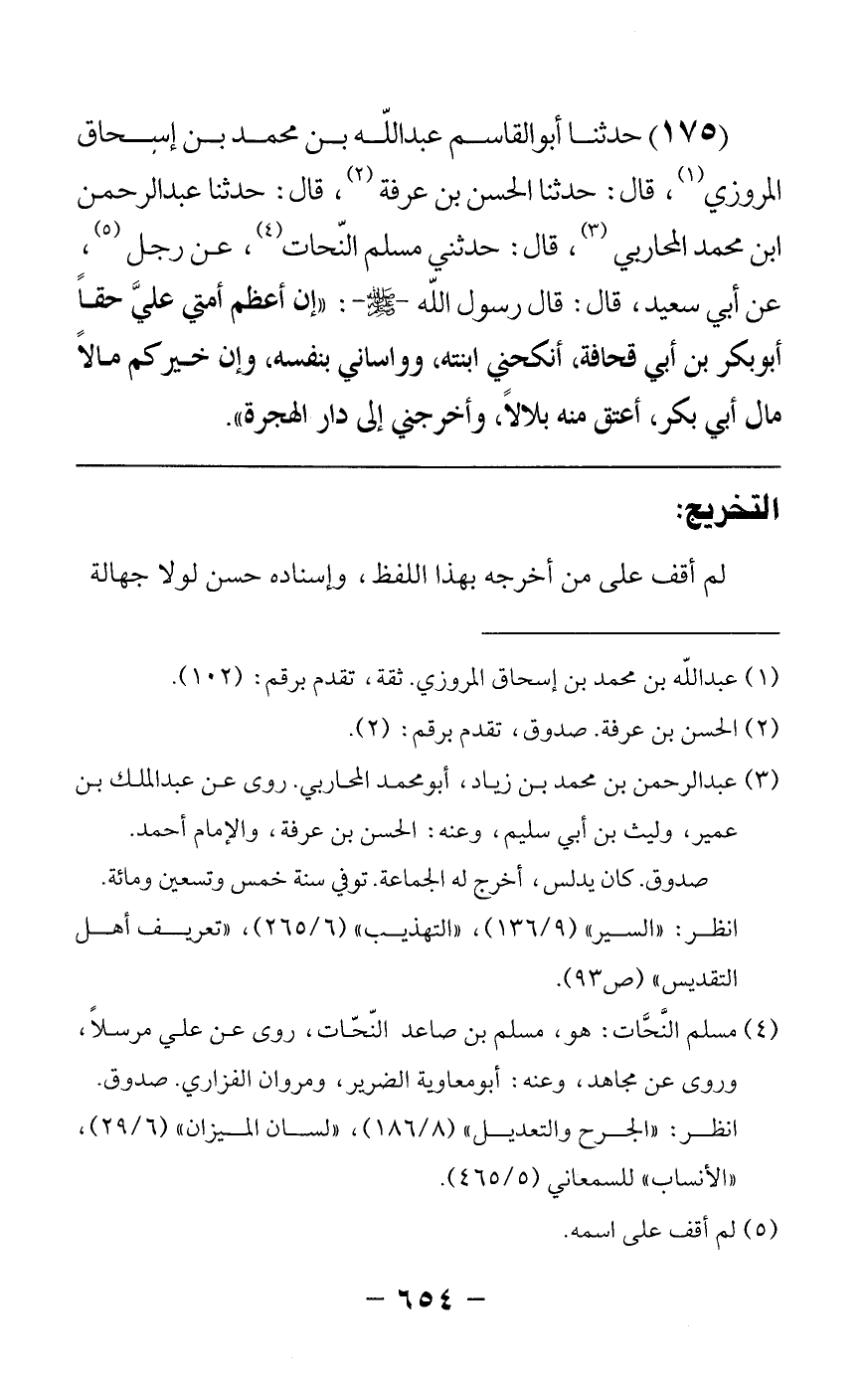 175 - حدثنا أبو القاسم عبدالله بن محمد بن إسحاق المروزي قال: حدثنا الحسن بن عرفة قال: حدثنا عبد الرحمن بن محمد المحاربي قال: حدثني مسلم النحات عن رجل عن أبي سعيد قال: قال رسول الله صلى الله عليه وسلم إن أعظم أمتي علي حقا أبو بكر بن أبي قحافة أنكحني ابنته وواساني بنفسه وإن خيركم مالا مال أبي بكر أعتق منه بلالا وأخرجني إلى دار الهجرة
