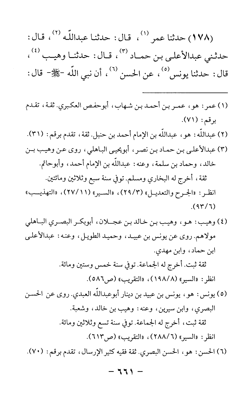 178 - حدثنا عمر قال: حدثنا عبدالله قال: حدثني عبد الأعلى بن حماد قال: حدثنا وهيب قال: حدثنا يونس عن الحسن أن نبي الله صلى الله عليه وسلم قال -[662]- ما نفعني مال في الإسلام ما نفعني مال أبي بكر