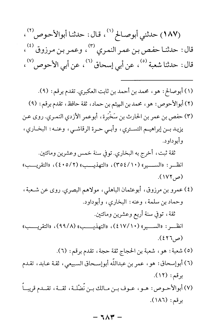 187 - حدثني أبو صالح, قال: حدثنا أبو الأحوص قال: حدثنا حفص بن عمر النمري وعمر بن مرزوق قال: حدثنا شعبة عن أبي إسحاق عن أبي الأحوص -[684]- عن عبدالله عن النبي صلى الله عليه وسلم قال لو كنت متخذا خليلا لاتخذت أبا بكر خليلا