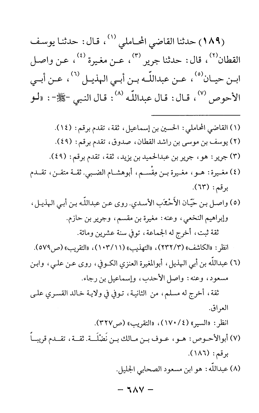 189 - حدثنا القاضي المحاملي قال: حدثنا يوسف القطان قال: حدثنا جرير عن مغيرة عن واصل ابن حيان عن عبدالله بن أبي الهذيل عن أبي الأحوص قال قال عبدالله قال النبي صلى الله عليه وسلم لو -[688]- كنت متخذا أحدا من أهل الأرض خليلا لاتخذت أبا بكر بن أبي قحافة خليلا ولكن صاحبكم خليل الله