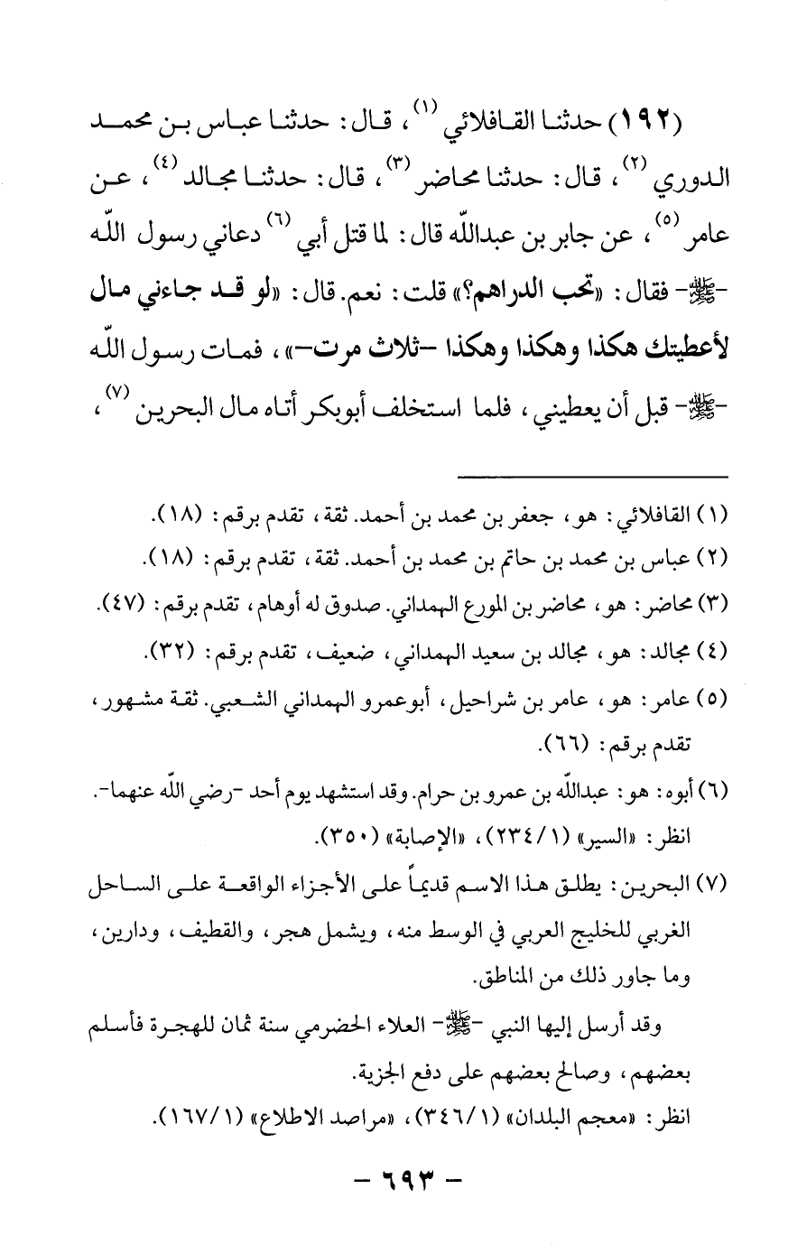 192 - حدثنا القافلائي قال: حدثنا عباس بن محمد بن الدوري قال: حدثنا محاضر قال: حدثنا مجالد عن عامر عن جابر بن عبدالله قال لما قتل أبي دعاني رسول الله صلى الله عليه وسلم فقال تحب الدراهم قلت نعم قال لو قد جاءني مال لأعطيتك هكذا وهكذا وهكذا ثلاث مرات فمات رسول الله صلى الله عليه وسلم قبل أن يعطيني فلما استخلف أبو بكر أتاه مال البحرين -[694]- فدعاني فقال خذ كما قال رسول الله صلى الله عليه وسلم قال فأخذت بكفي جماعا حفنة واحدة فخشيت أن آخذ الأخرى أقل منها فقلت عدوا هذه وأعطوني مثلها مرتين قال فضحك أبو بكر رحمه الله