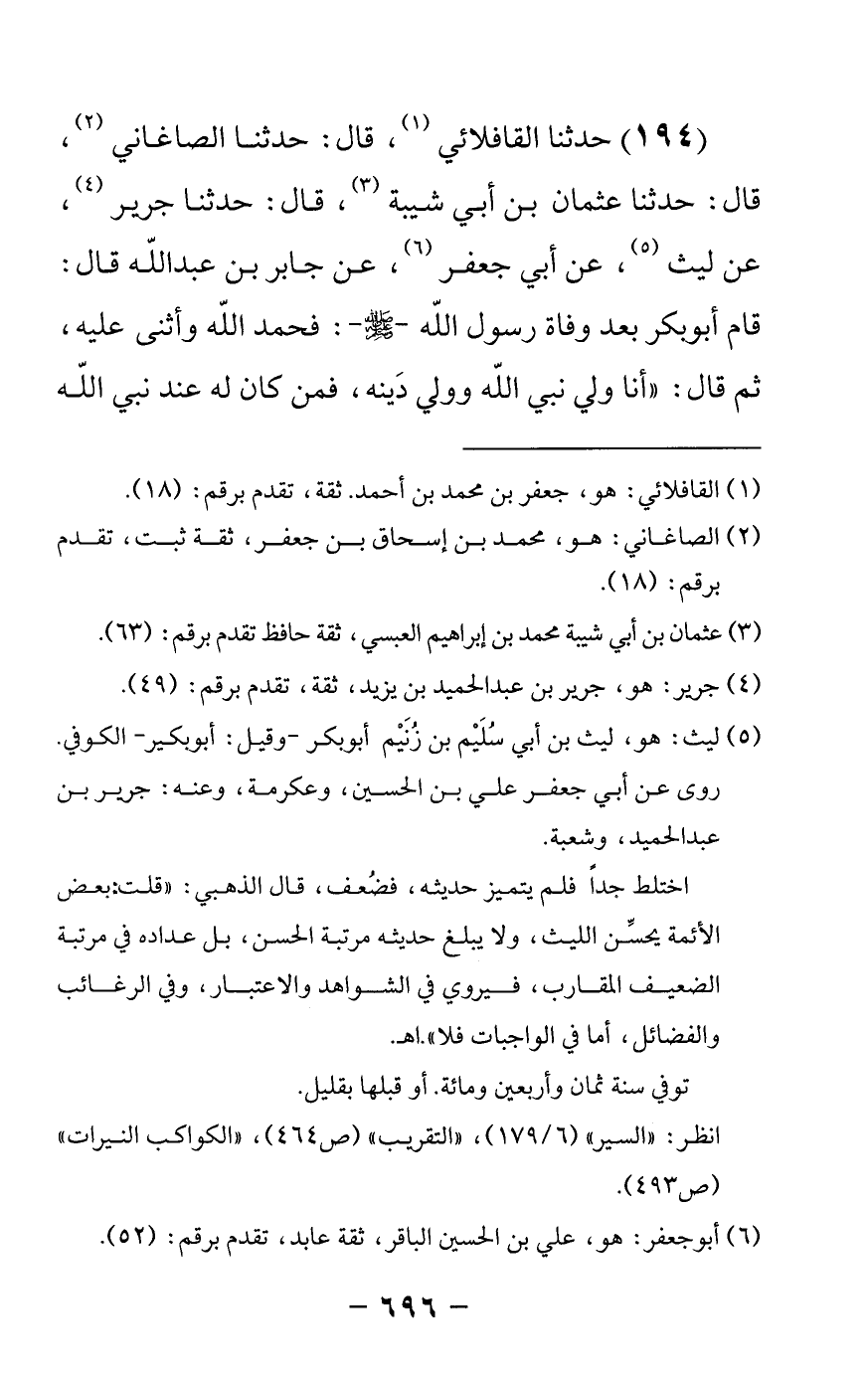 194 - حدثنا القافلائي قال: حدثنا الصاغاني قال: حدثنا عثمان بن أبي شيبة قال: حدثنا جرير عن ليث عن أبي جعفر عن جابر بن عبدالله قال قام أبو بكر بعد وفاة رسول الله صلى الله عليه وسلم فحمد الله وأثنى عليه, ثم قال: أنا ولي نبي الله وولي دينه فمن كان له عند نبي الله -[697]- صلى الله عليه وسلم عدة فأنا أنجزها ومن كان له على نبي الله صلى الله عليه وسلم دين فأنا أقضيه قال فقلت إني سألت رسول الله صلى الله عليه وسلم فقال إذا جاءنا مال البحرين حثيت لك ثم حثيت لك فقال خذ قال فأخذت حتى أخذت بعددها مرتين أو قال حثيت ثلاث حثيات