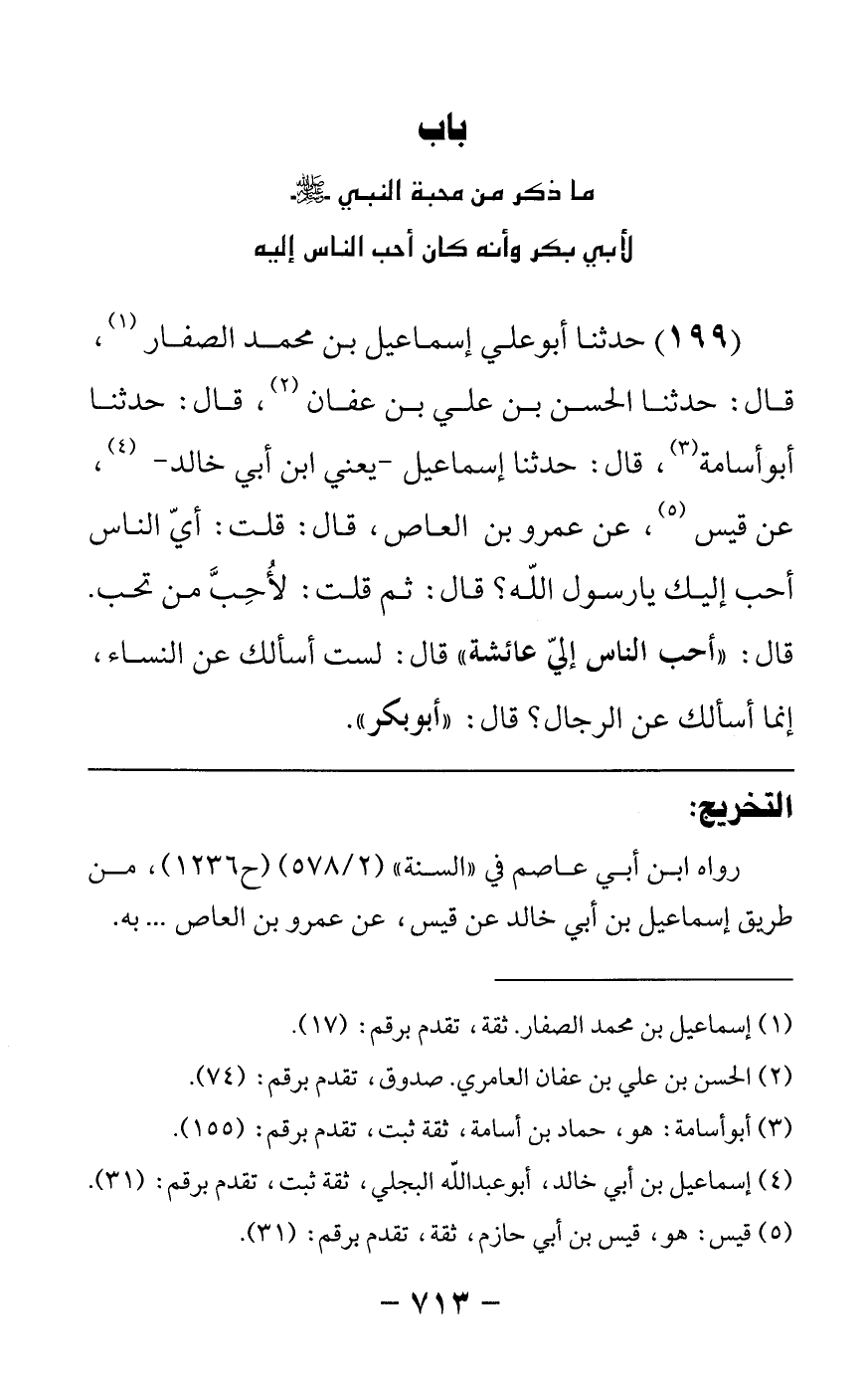199 - حدثنا أبو علي إسماعيل بن محمد الصفار قال: حدثنا الحسن بن علي بن عفان قال: حدثنا أبو أسامة قال: حدثنا إسماعيل يعني ابن أبي خالد عن قيس عن عمرو بن العاص قال قلت أي الناس أحب إليك يا رسول الله؟ قال ثم قلت لأحب من تحب قال أحب الناس إلي عائشة قال لست أسألك عن النساء إنما أسألك عن الرجال قال أبو بكر