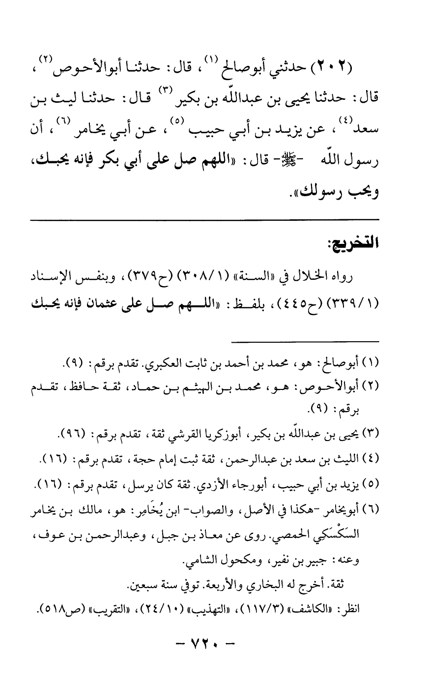 202 - حدثني أبوصالح, قال: حدثنا أبو الأحوص قال: حدثنا يحيى بن عبدالله بن بكير قال: حدثنا ليث بن سعد عن يزيد بن أبي حبيب عن أبي يخامر أن رسول الله صلى الله عليه وسلم قال اللهم صل على أبي بكر فإنه يحبك ويحب رسولك