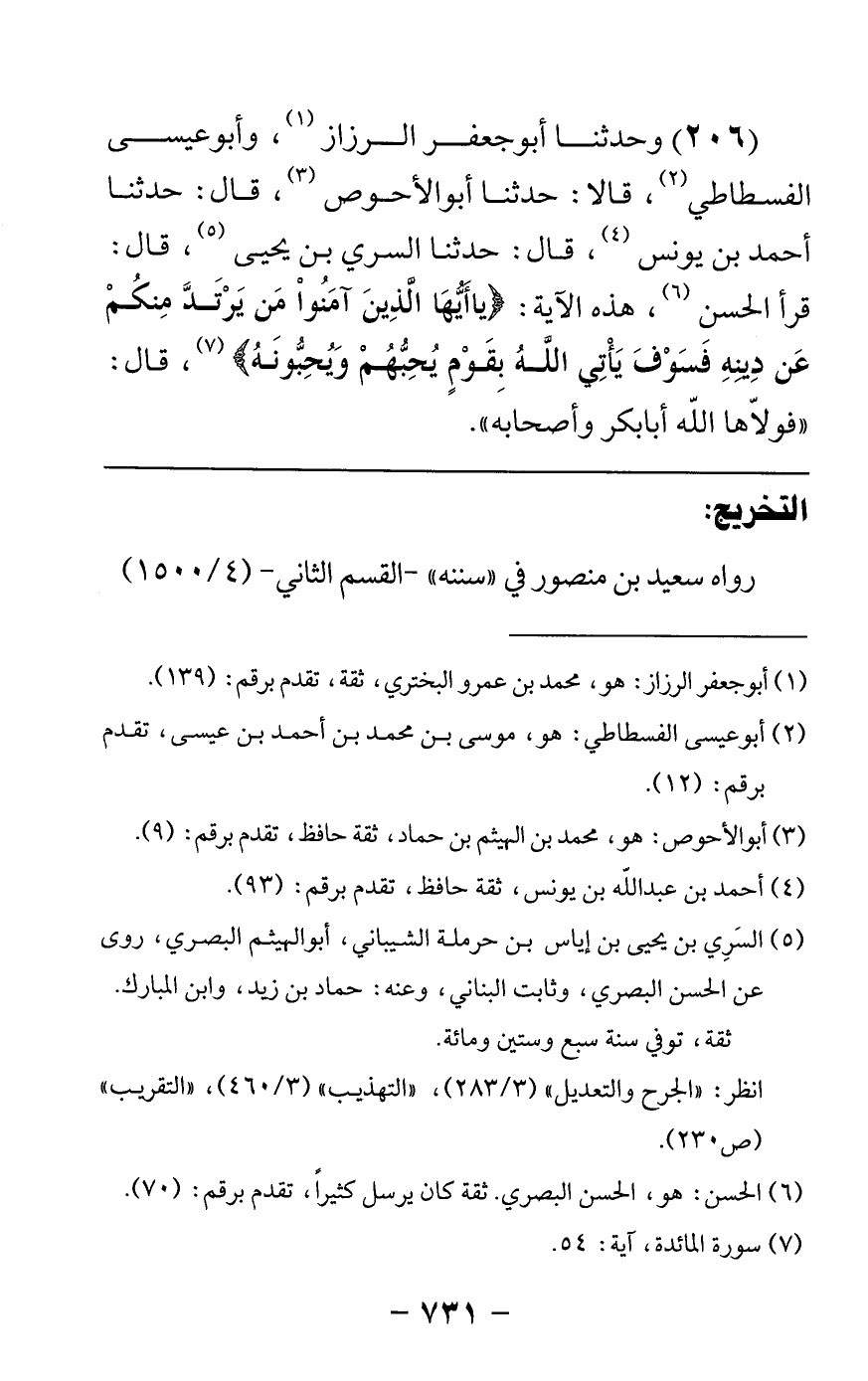 206 - وحدثنا أبو جعفر الرزاز وأبو عيسى الفسطاطي قالا حدثنا أبو الأحوص قال: حدثنا أحمد بن يونس قال حدثنا السري بن يحيى قال قرأ الحسن هذه الآية {يا أيها الذين آمنوا من يرتد منكم عن دينه فسوف يأتي الله بقوم يحبهم ويحبونه} قال فولاها الله أبا بكر وأصحابه