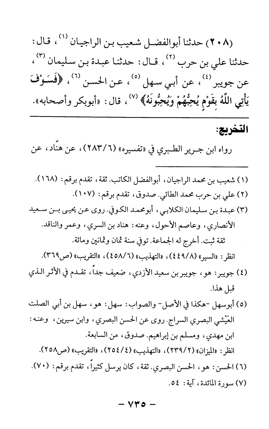 208 - حدثنا أبو الفضل شعيب بن الراجيان قال: حدثنا علي بن حرب قال: حدثنا عبدة بن سليمان عن جويبر عن أبي سهل عن الحسن {فسوف يأتي الله بقوم يحبهم ويحبونه} قال أبو بكر وأصحابه
