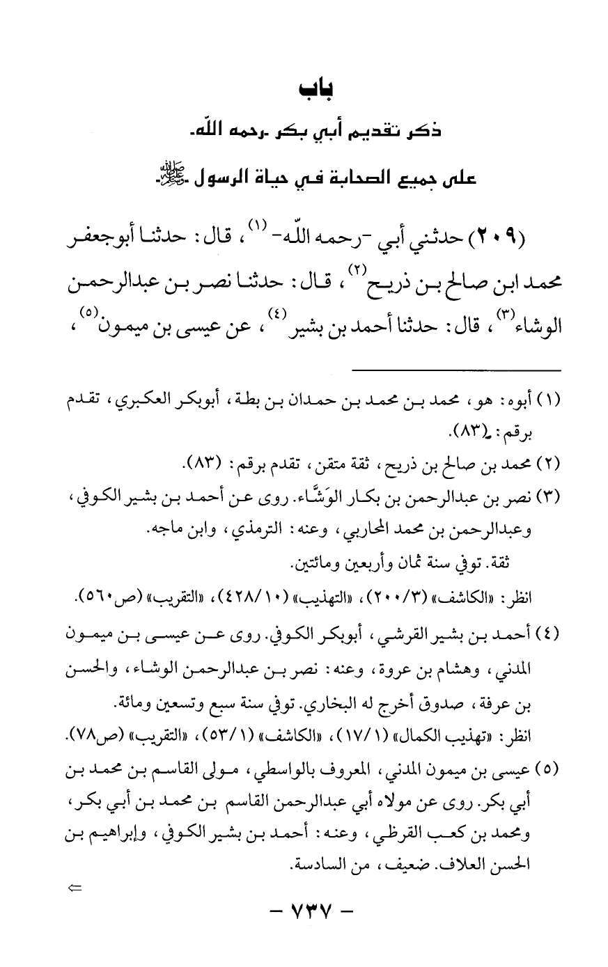 209 - حدثني أبي رحمه الله قال: حدثنا أبو جعفر محمد بن صالح بن ذريح قال: حدثنا نصر بن عبد الرحمن الوشاء قال: حدثنا أحمد بن بشير عن عيسى بن ميمون -[738]- عن القاسم بن عبد الرحمن عن عائشة رضي الله عنها قالت قال رسول الله صلى الله عليه وسلم لا ينبغي لقوم يكون فيهم أبو بكر أن يؤمهم غيره
