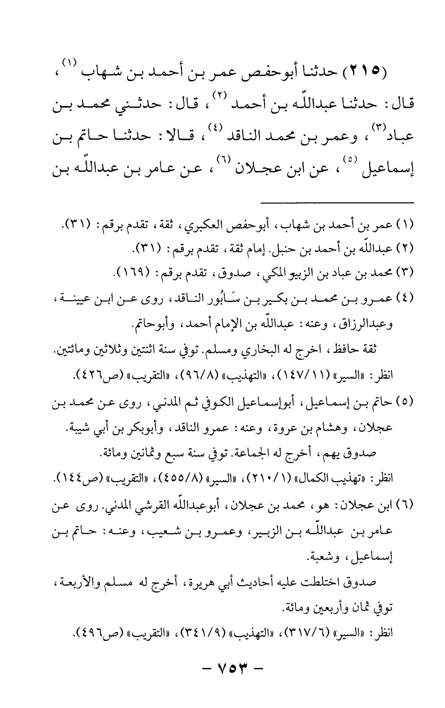 215 - حدثنا أبو حفص عمر بن أحمد بن شهاب قال: حدثنا عبدالله بن أحمد قال: حدثني محمد بن عباد وعمرو بن محمد الناقد قالا حدثنا حاتم بن إسماعيل عن ابن عجلان عن عامر بن عبدالله بن -[754]- الزبير عن أبيه أن عمر ذكر أبا بكر وهو على المنبر فقال إن أبا بكر كان سابقا مبرزا