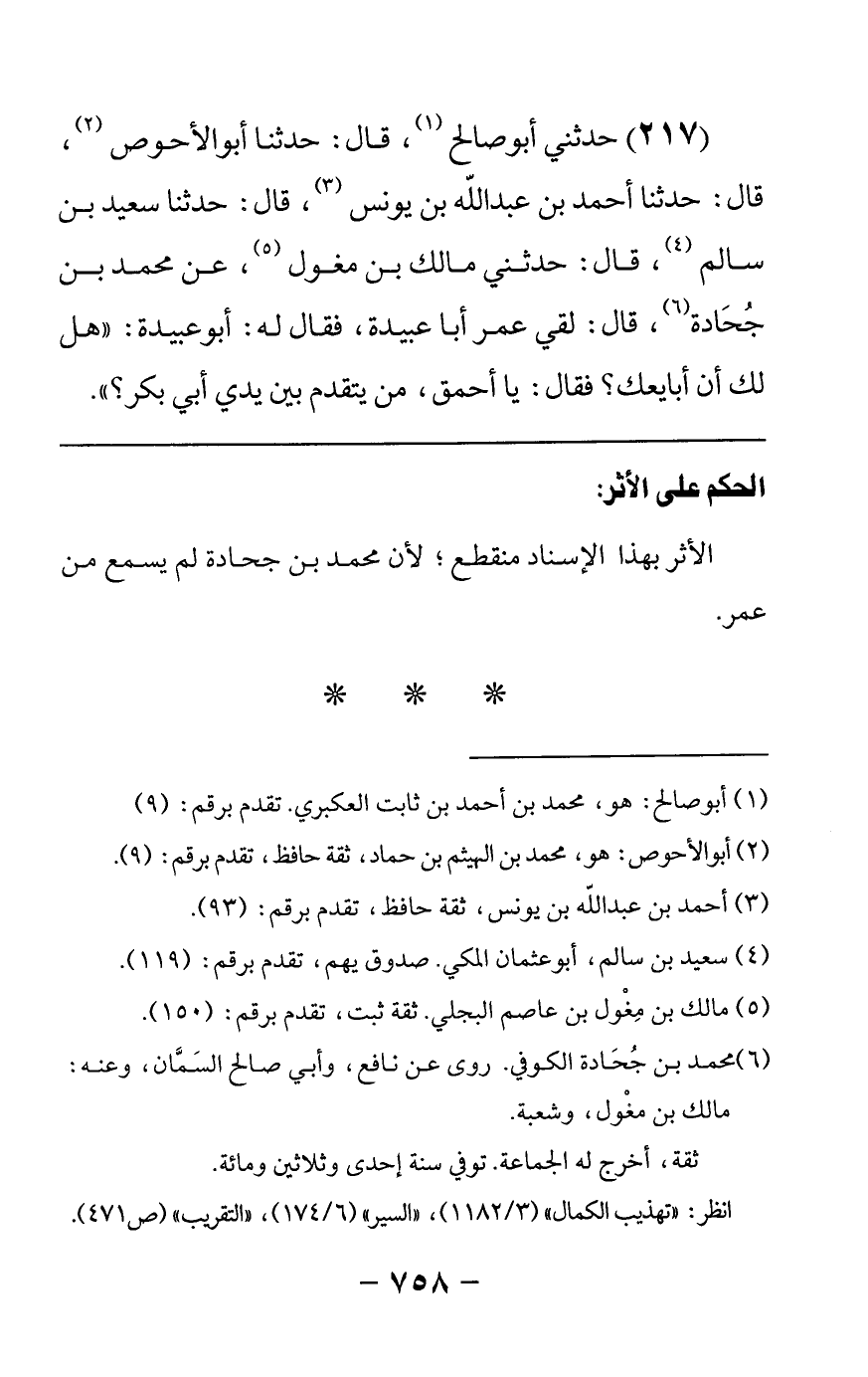 217 - حدثني أبو صالح قال: حدثنا أبو الأحوص قال: حدثنا أحمد بن عبدالله بن يونس قال: حدثنا سعيد بن سالم قال: حدثني مالك بن مغول عن محمد بن جحادة قال لقي عمر أبا عبيدة قال له أبو عبيدة هل لك أن أبايعك فقال يا أحمق من يتقدم بين يدي أبي بكر
