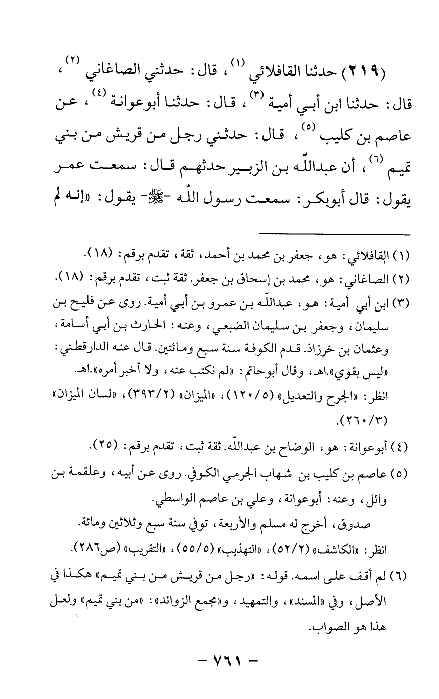 219 - حدثنا القافلائي قال: حدثني الصاغاني قال: حدثنا ابن أبي أمية, قال: حدثنا أبو عوانة عن عاصم بن كليب قال: حدثني رجل من قريش من بني تميم أن عبدالله بن الزبير حدثهم قال: سمعت عمر يقول قال أبو بكر سمعت رسول الله صلى الله عليه وسلم يقول إنه لم -[762]- يقبض نبي حتى يؤمه رجل من أمته