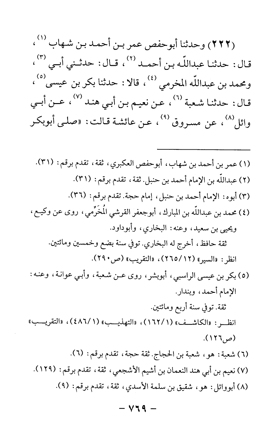 222 - وحدثنا أبو حفص عمر بن أحمد بن شهاب قال: حدثنا عبدالله بن أحمد قال: حدثني أبي ومحمد بن عبدالله المخرمي قالا حدثنا بكر بن عيسى قال: حدثنا شعبة عن نعيم بن أبي هند عن أبي وائل عن مسروق عن عائشة قالت صلى أبو بكر -[770]- بالناس ورسول الله صلى الله عليه وسلم في الصف