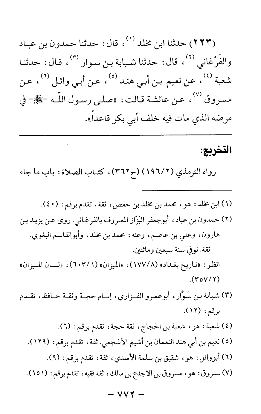 223 - حدثنا ابن مخلد قال: حدثنا حمدون بن عباد والفرغاني قال: حدثنا شبابة بن سوار قال: حدثنا شعبة عن نعيم بن أبي هند عن أبي وائل عن مسروق عن عائشة قالت صلى رسول الله صلى الله عليه وسلم في مرضه الذي مات فيه خلف أبي بكر قاعدا
