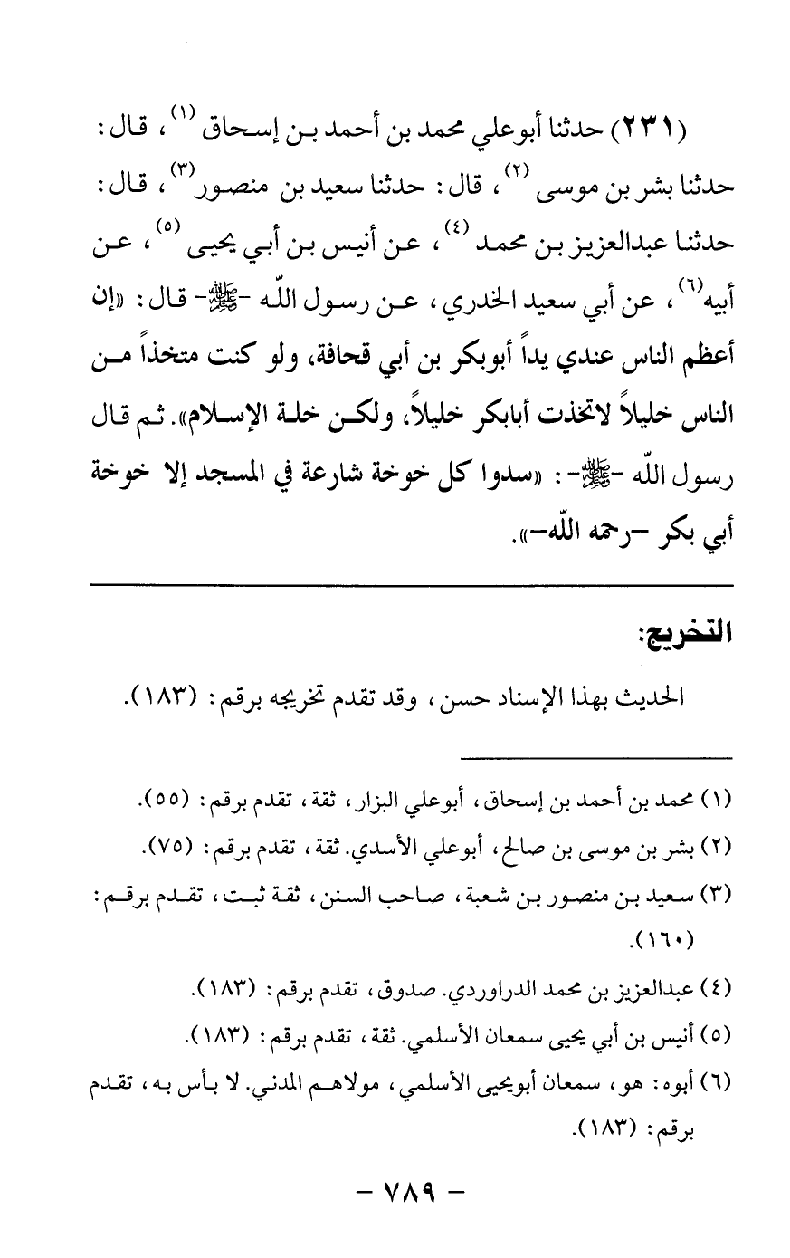 231 - حدثنا أبو علي محمد بن أحمد بن إسحاق قال: حدثنا بشر بن موسى قال: حدثنا سعيد بن منصور قال: حدثنا عبد العزيز بن محمد عن أنيس بن أبي يحيى عن أبيه عن أبي سعيد الخدري عن رسول الله صلى الله عليه وسلم قال إن أعظم الناس عندي يدا أبو بكر بن أبي قحافة ولو كنت متخذا من الناس خليلا لاتخذت أبا بكر خليلا ولكن خلة الإسلام, ثم قال رسول الله صلى الله عليه وسلم: سدوا كل خوخة شارعة في المسجد إلا خوخة أبي بكر رحمه الله