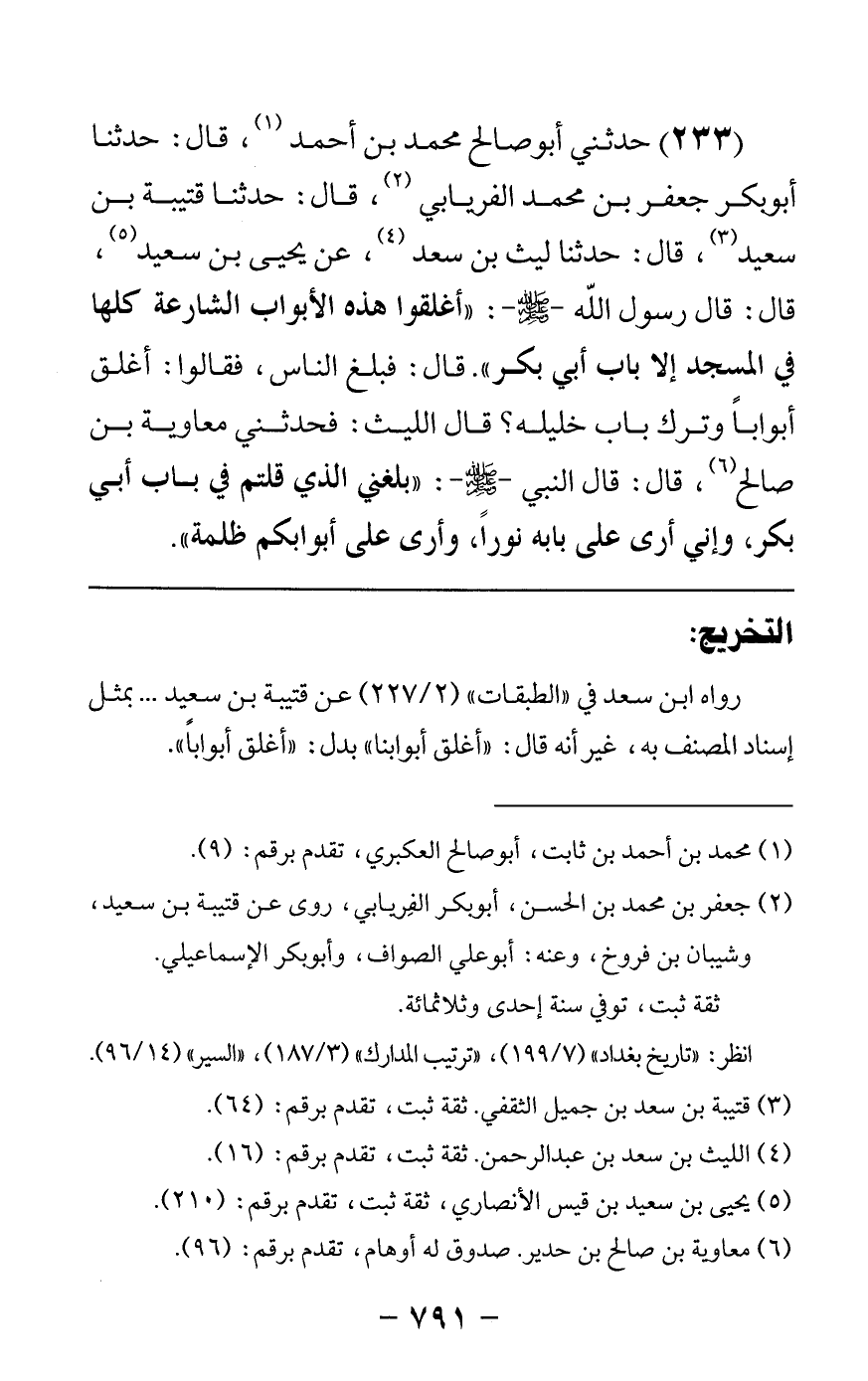 233 - حدثني أبو صالح محمد بن أحمد قال: حدثنا أبو بكر جعفر بن محمد الفريابي قال: حدثنا قتيبة بن سعيد قال: حدثنا ليث بن سعد عن يحيى بن سعيد قال: قال رسول الله صلى الله عليه وسلم أغلقوا هذه الأبواب الشارعة كلها في المسجد إلا باب أبي بكر قال فبلغ الناس فقالوا أغلق أبوابا وترك باب خليله قال الليث فحدثني معاوية بن صالح قال قال النبي صلى الله عليه وسلم بلغني الذي قلتم في باب أبي بكر وإني أرى على بابه نورا وأرى على أبوابكم ظلمة