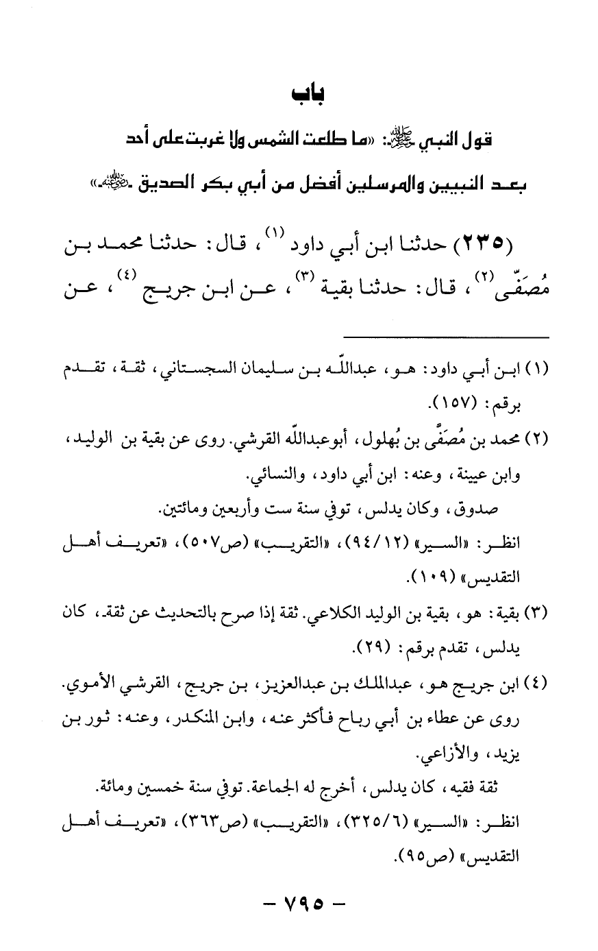 235 - حدثنا ابن أبي داود قال: حدثنا محمد بن مصفى قال: حدثنا بقية عن ابن جريج عن -[796]- عطاء عن أبي الدرداء قال رآني النبي صلى الله عليه وسلم وانا أمشي أمام أبي بكر فقال لي تمشي أمام من هو خير منك إن أبا بكر خير من طلعت عليه الشمس أو غربت