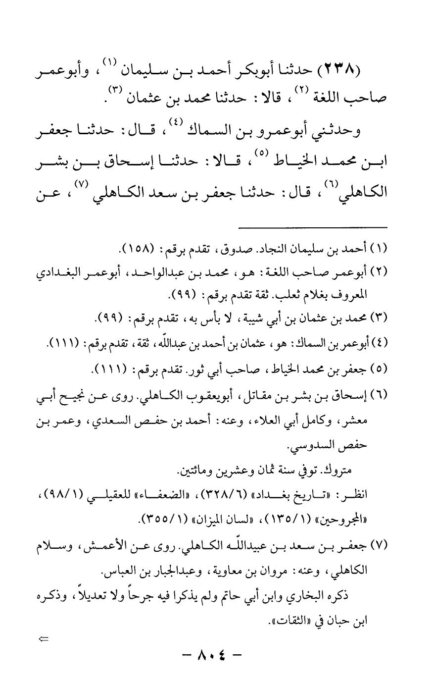238 - حدثنا أبو بكر أحمد بن سليمان وأبو عمر صاحب اللغة قالا حدثنا محمد بن عثمان وحدثني أبو عمرو بن السماك قال: حدثنا جعفر بن محمد الخياط قالا حدثنا إسحاق بن بشر الكاهلي قال: حدثنا جعفر بن سعد الكاهلي عن -[805]- ليث عن مجاهد عن ابن عباس رضي الله عنه قال ذكر أبو بكر الصديق عند رسول الله صلى الله عليه وسلم فقال رسول الله صلى الله عليه وسلم وأين مثل أبي بكر كذبني الناس وصدقني وآمن بي وزوجني ابنته وجهزني بماله وجاهد معي في ساعة العسرة وليلة العسرة أما إنه سيأتي يوم القيامة على ناقة من نوق الجنة رحالها من الزبرجد الأخضر وقوائمها من المسك والعنبر وزمامها من اللؤلؤ الرطب وعليه حلتان خضراوان من سندس وإستبرق فيحاكني في القيامة وأحاكه فيقال من هذا فيقال هذا محمد وهذا أبو بكر الصديق رضي الله عنه