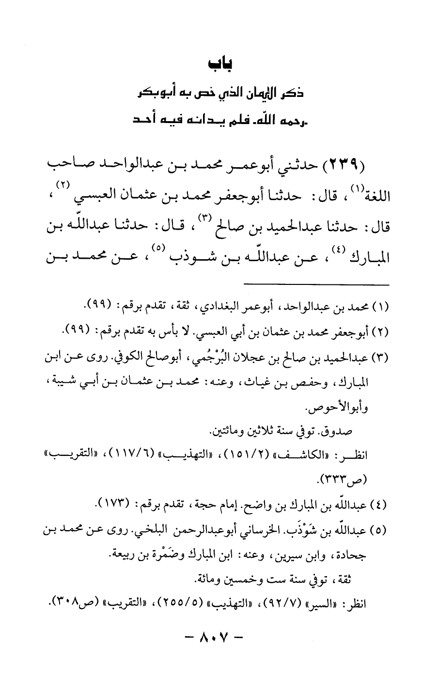 239 - حدثني أبو عمر محمد بن عبد الواحد صاحب اللغة قال: حدثنا أبو جعفر محمد بن عثمان العبسي قال: حدثنا عبد الحميد بن صالح قال: حدثنا عبدالله بن المبارك عن عبدالله بن شوذب عن محمد بن -[808]- جحادة عن سلمة بن كهيل عن هزيل بن شرحبيل عن عمر بن الخطاب رضي الله عنه قال لو وزن إيمان أبي بكر الصديق رحمه الله بإيمان أهل الأرض لرجح إيمان أبي بكر رضي الله عنه بإيمان أهل الأرض