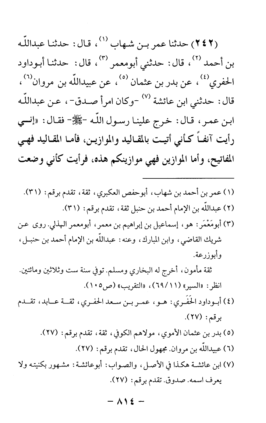 242 - حدثنا عمر بن شهاب قال: حدثنا عبدالله بن أحمد قال: حدثني أبو معمر قال: حدثنا أبو داود الحفري عن بدر بن عثمان عن عبيدالله بن مروان قال: حدثني ابن عائشة وكان امرأ صدق عن عبدالله بن عمر قال خرج علينا رسول الله صلى الله عليه وسلم فقال إني رأيت آنفا كأني أتيت بالمقاليد والموازين فأما المقاليد فهي المفاتيح وأما الموازين فهي موازينكم هذه فرأيت كأني وضعت -[815]- في كفة الميزان ووضعت أمتي في كفة فرجحت بهم ثم وضع أبو بكر ووضعت أمتي فرجح بهم