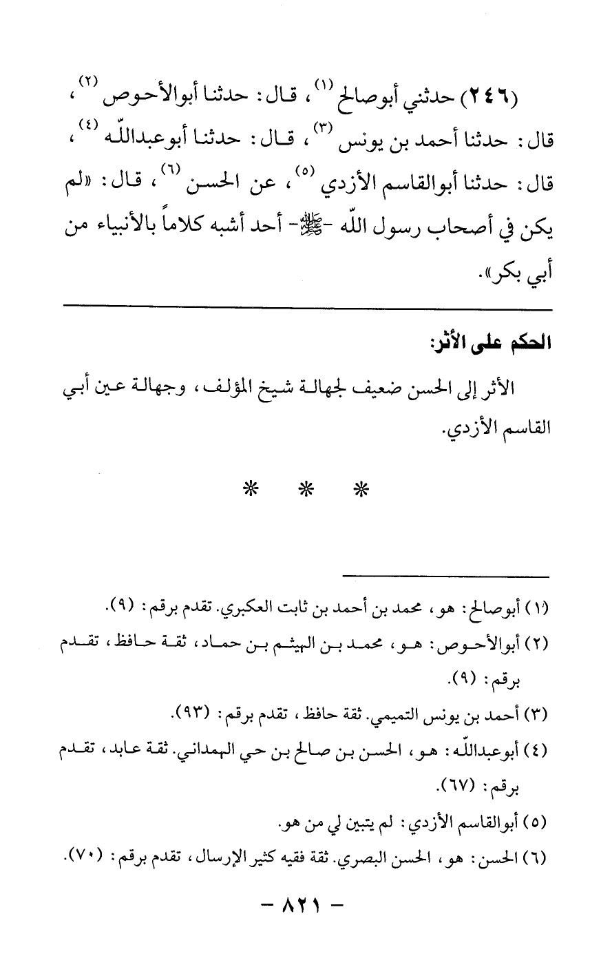 246 - حدثني أبو صالح, قال: حدثنا أبو الأحوص قال: حدثنا أحمد بن يونس قال: حدثنا أبو عبدالله قال: حدثنا أبو القاسم الأزدي عن الحسن قال لم يكن في أصحاب رسول الله صلى الله عليه وسلم أحد أشبه كلاما بالأنبياء من أبي بكر