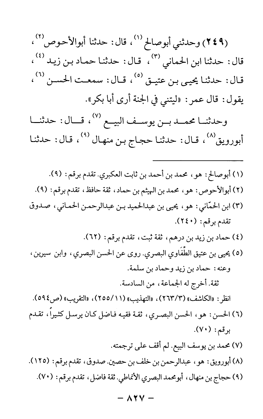 249 - وحدثني أبو صالح, قال: حدثنا أبو الأحوص قال: حدثنا ابن الحماني قال: حدثنا حمَّاد بن زَيْد قال: حدثنا يحيى بن عتيق قال: سمعت الحسن يقول قال عمر رضي الله عنه ليتني في الجنة أرى أبا بكر