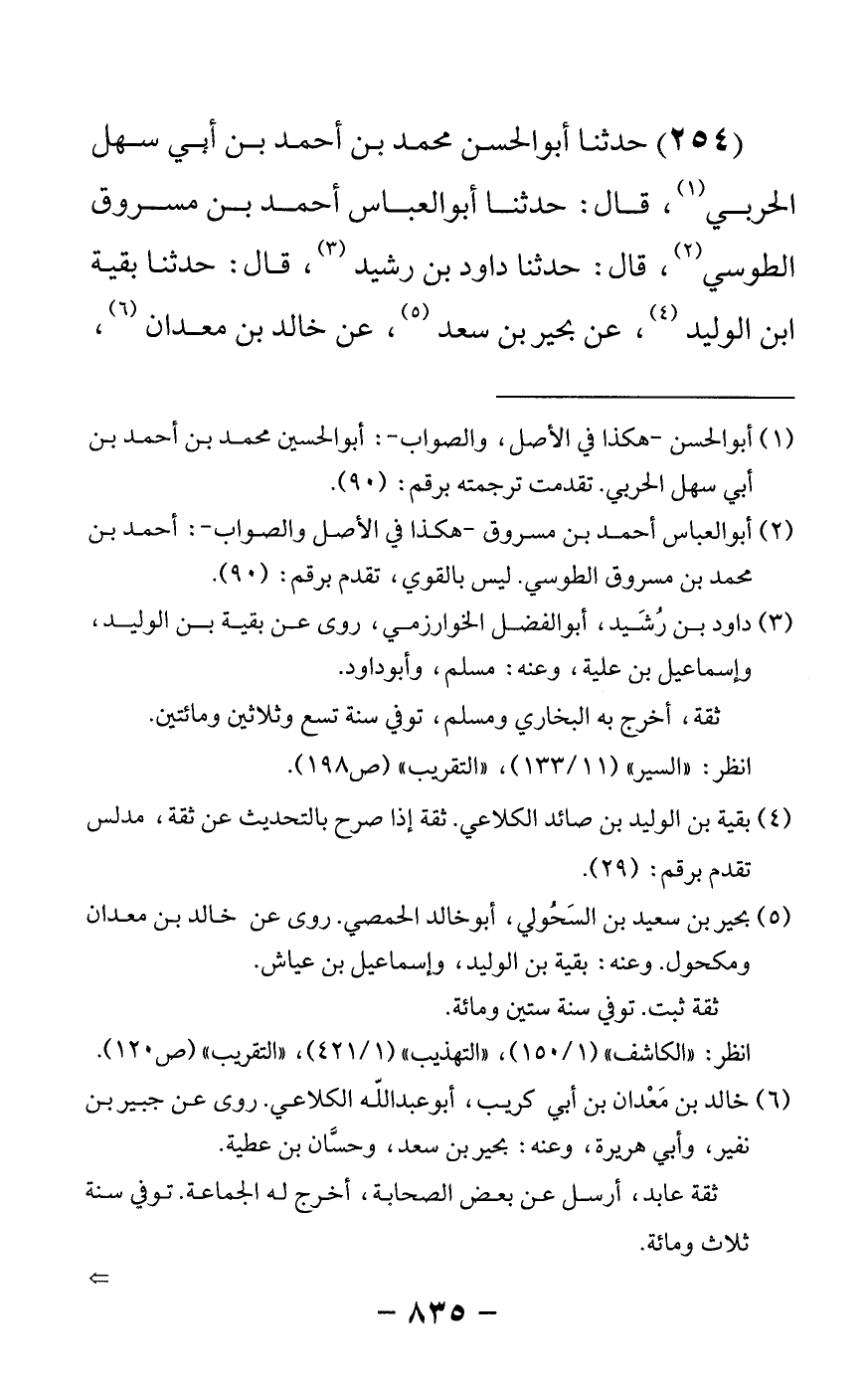 254 - حدثنا أبو الحسن محمد بن أحمد بن أبي سهل الحربي قال: حدثنا أبو العباس أحمد بن مسروق الطوسي قال: حدثنا داود بن رشيد قال: حدثنا بقية بن الوليد عن بحير بن سعد عن خالد بن معدان -[836]- عن جبير بن نفير أن نفرا قالوا لعمر رضي الله عنه ما رأينا رجلا أقضى بالقسط ولا أقول بالحق ولا أشر على المنافقين منك يا أمير المؤمنين فأنت خير الناس بعد رسول الله صلى الله عليه وسلم فأنصت عنهم عمر فقال عوف بن مالك كذبتم والله لقد رأيت خيرا منه عند رسول الله صلى الله عليه وسلم فأقبل عمر فقال من هو يا عوف قال أبو بكر قال عمر صدق عوف وكذبتم والله لقد كان أبو بكر أطيب من المسك وإني لمثل بعير أهلي