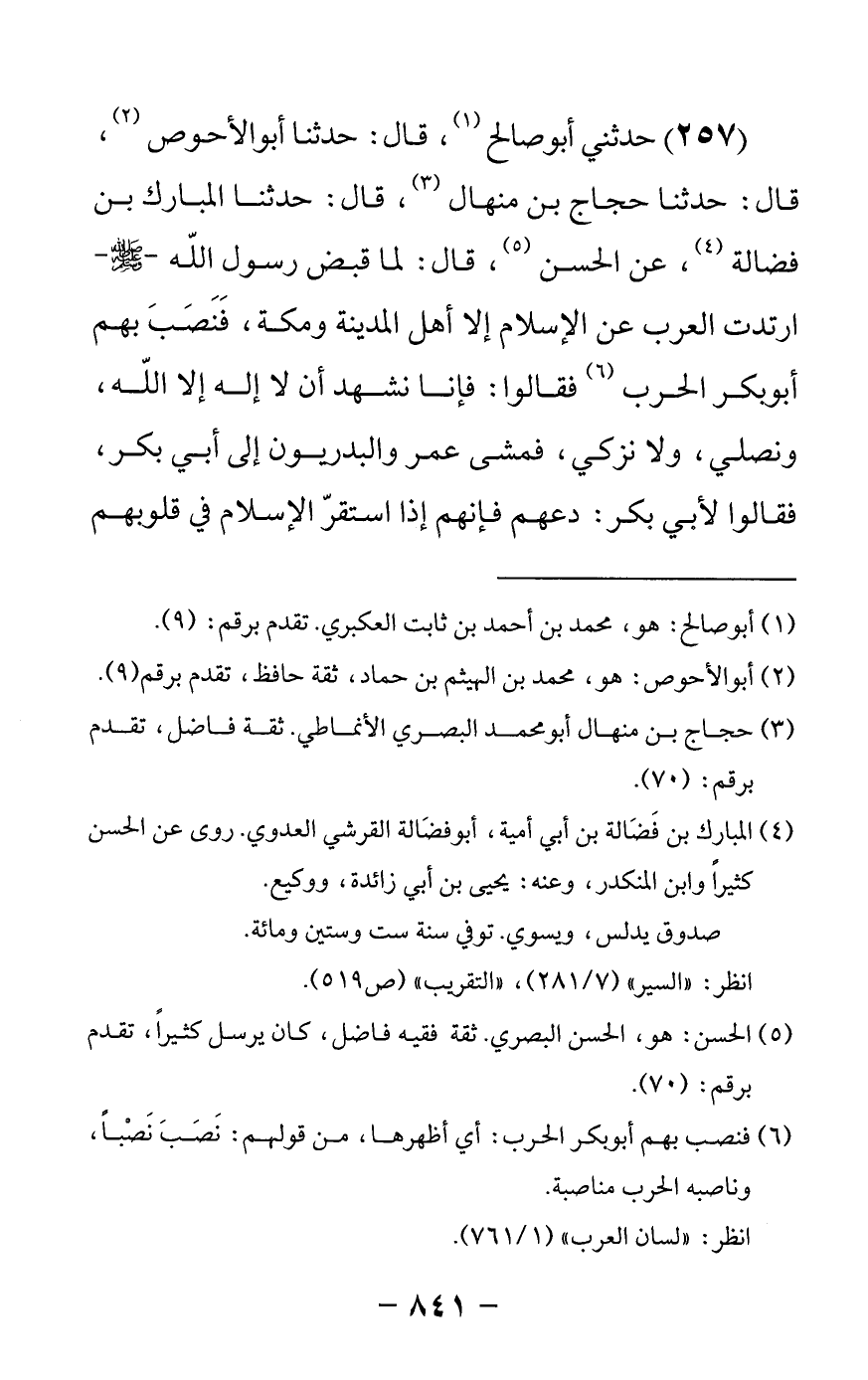 257 - حدثني أبو صالح, قال: حدثنا أبو الأحوص قال: حدثنا حجاج بن منهال قال: حدثنا المبارك بن فضالة عن الحسن قال لما قبض رسول الله صلى الله عليه وسلم ارتدت العرب عن الإسلام إلا أهل المدينة ومكة فنصب بهم أبو بكر الحرب فقالوا فإنا نشهد أن لا إله إلا الله ونصلي ولا نزكي فمشى عمر والبدريون إلى أبي بكر فقالوا لأبي بكر دعهم فإنهم إذا استقر الإسلام في قلوبهم -[842]- وثبت أدوا فقال والله لو منعوني عقالا مما أخذ رسول الله صلى الله عليه وسلم قاتلتهم عليه قاتل رسول الله صلى الله عليه وسلم الناس على ثلث شهادة أن لا إله إلا الله {فإن تابوا وأقاموا الصلاة وآتوا الزكاة فخلوا سبيلهم} والله لا أسأل الناس فوقهن ولا أقصر دونهن فقال له عمر أليس قد قال رسول الله صلى الله عليه وسلم أمرت أن أقاتل الناس حتى يقولوا لا إله إلا الله فإذا قالوها عصموا مني دماءهم وأموالهم إلا بحقها وحسابهم على الله عز وجل قال أبو بكر فهذا من حقها فقال عمر رضي الله عنه فلما رأيت أبا بكر انشرح صدره لقتالهم رأيت أن الحق في ذلك وفي أن أتبعه فاتبعته فقاتل من أدبر