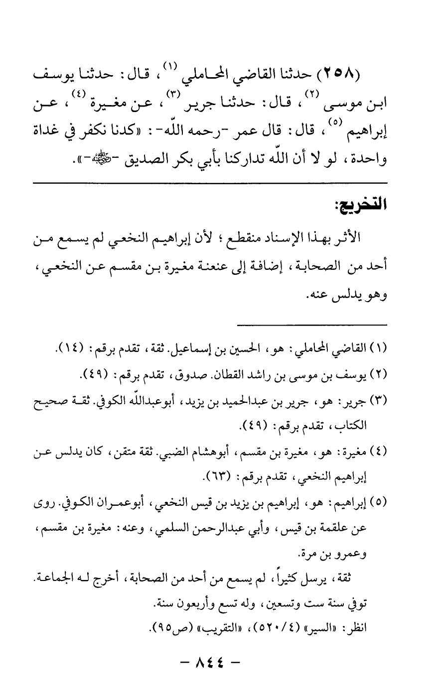 258 - حدثنا القاضي المحاملي قال: حدثنا يوسف بن موسى قال: حدثنا جرير عن مغيرة عن إبراهيم قال قال عمر رحمه الله كدنا نكفر في غداة واحدة لولا أن الله تداركنا بأبي بكر الصديق رضي الله عنه