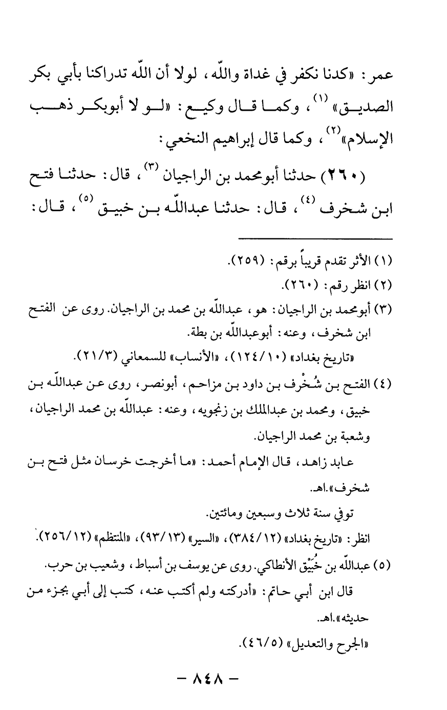 260 - حدثنا أبو محمد بن الراجيان قال: حدثنا فتح بن شخرف قال: حدثنا عبدالله بن خبيق قال: -[849]- حدثنا يوسف بن أسباط قال: حدثنا سفيان عن منصور عن إبراهيم قال لو نزل في أبي بكر قرآن بعد النبي صلى الله عليه وسلم لنزل {وما أرسلناك إلا رحمة للعالمين}
