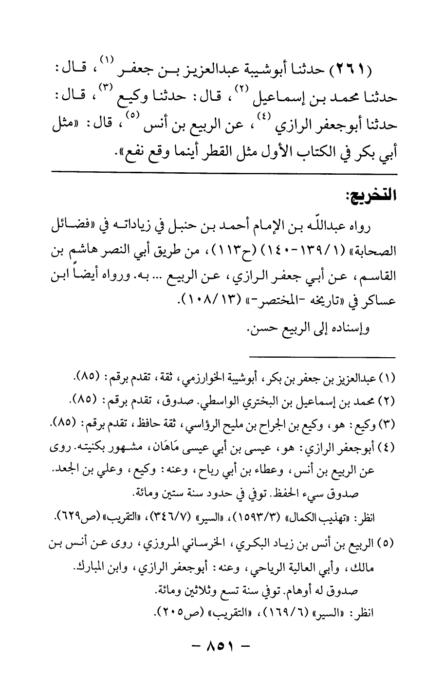 261 - حدثنا أبو شيبة عبد العزيز بن جعفر قال: حدثنا محمد بن إسماعيل قال حدثنا وكيع قال: حدثنا أبو جعفر الرازي عن الربيع بن أنس قال مثل أبي بكر في الكتاب الأول مثل القطر أينما وقع نفع