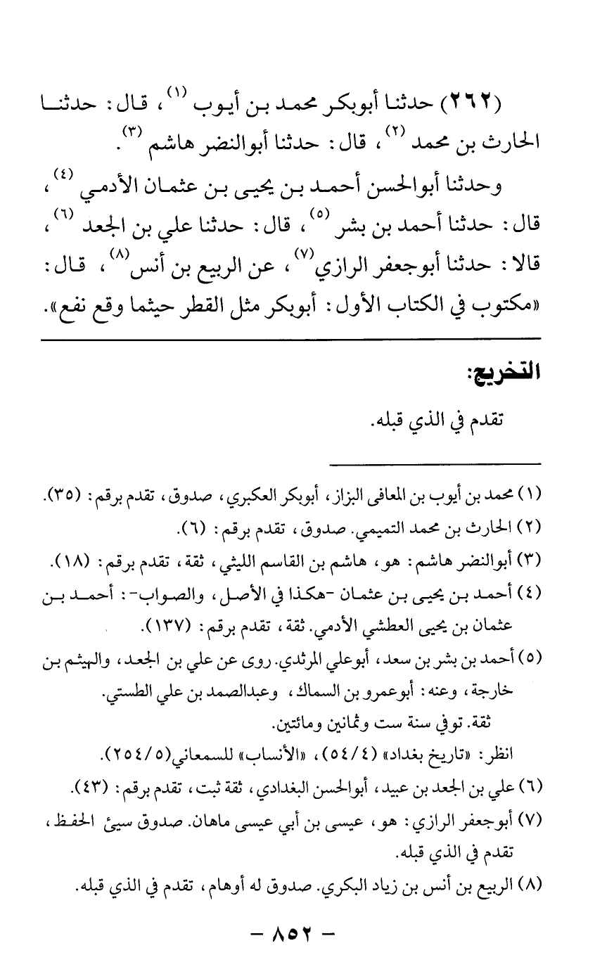 262 - حدثنا أبو بكر محمد بن أيوب قال: حدثنا الحارث بن محمد قال: حدثنا أبو النضر هاشم وحدثنا أبو الحسن أحمد بن يحيى بن عثمان الأدمي قال: حدثنا أحمد بن بشر قال: حدثنا علي بن الجعد قالا حدثنا أبو جعفر الرازي عن الربيع بن أنس قال مكتوب في الكتاب الأول أبو بكر مثل القطر حيثما وقع نفع