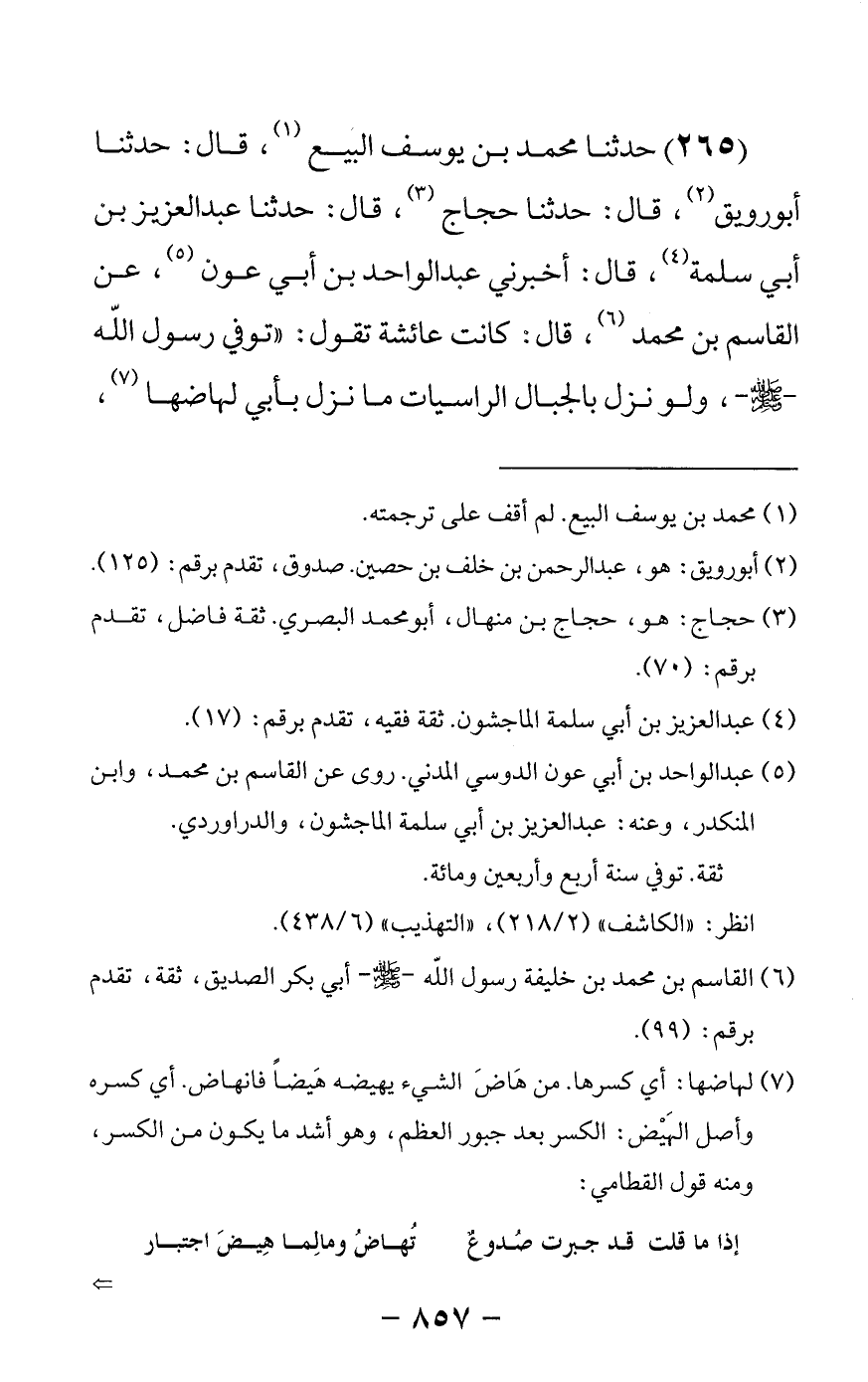 265 - حدثنا محمد بن يوسف البيع قال: حدثنا أبو رويق قال: حدثنا حجاج قال: حدثنا عبد العزيز بن أبي سلمة قال: أخبرني عبد الواحد بن أبي عون عن القاسم بن محمد قال كانت عائشة تقول توفي رسول الله صلى الله عليه وسلم ولو نزل بالجبال الراسيات ما نزل بأبي لهاضها -[858]- اشرأب النفاق بالمدينة فارتدت العرب فوالله ما اختلفوا في نقطة إلا طار أبي بخظها وغنائها.