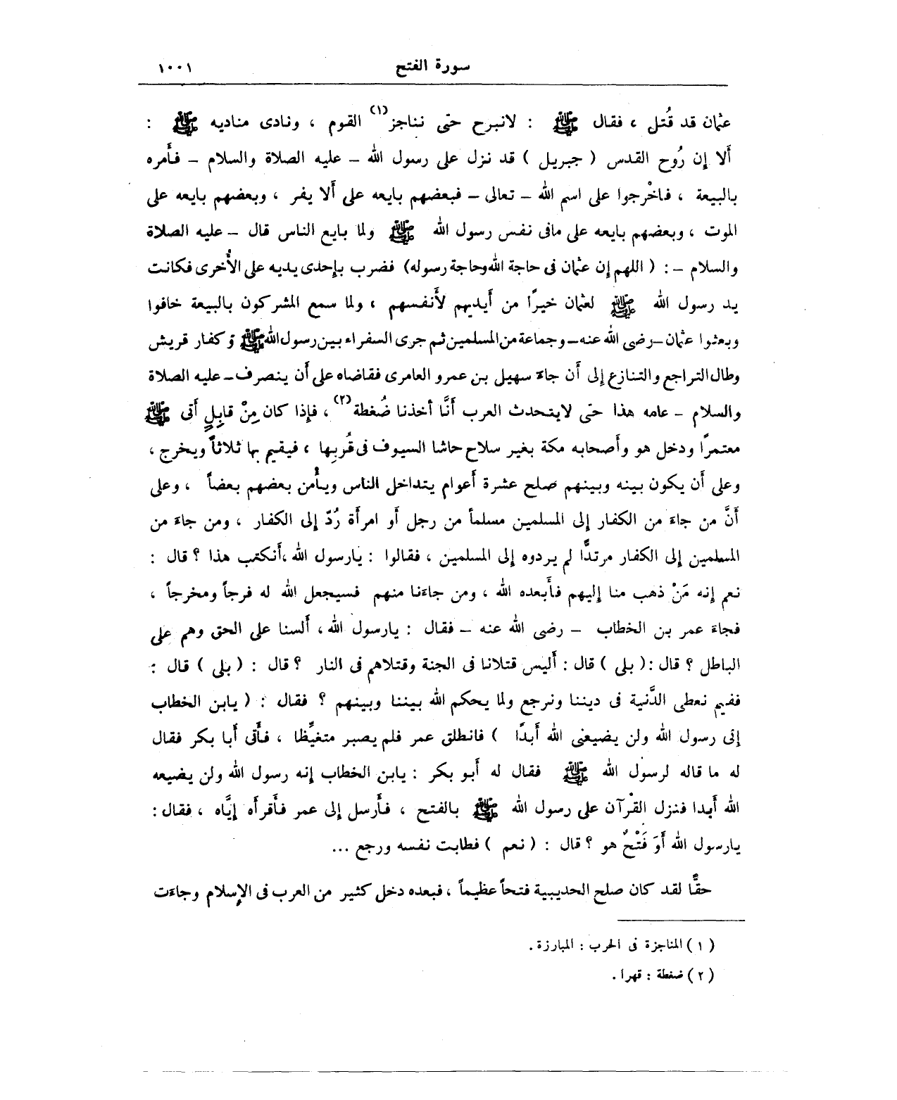عثمان قد قُتل، فقال - صلى الله عليه وسلم -: لا نبرح حتى نناجز (¬1) القوم، ونادى مناديه - صلى الله عليه وسلم -: ألا إن روح القدس (جبريل) قد نزل على رسول الله - عليه الصلاة والسلام - فأمره بالبيعة، فاخرجوا على اسم الله - تعالى - فبعضهم بايعه على ألا يفر، وبعضهم بايعه على الموت، وبعضهم بايعه على ما في نفس رسول الله - صلى الله عليه وسلم - ولما بايع الناس قال - عليه الصلاة والسلام -: (اللهم إن عثمان في حاجة الله وحاجة رسوله) فضرب بإحدى يديه على الأخرى فكانت يد رسول الله - صلى الله عليه وسلم - لعثمان خيرا من أيديهم لأنفسهم، ولما سمع المشركون بالبيعة خافوا وبعثوا عثمان - رضي الله عنه - وجماعة من المسلمين ثم جرى السفراء بين رسول الله - صلى الله عليه وسلم - وكفار قريش وطال التراجع والتنازع إلى أن جاء سهيل بن عمرو العامرى فقاضاه على أن ينصرف - عليه الصلاة والسلام - عامه هذا حتى لا يتحدث العرب أنَّا أخذنا ضُغطة (¬2)، فإذا كان من قابل أتى - صلى الله عليه وسلم - معتمرا ودخل هو وأصحابه مكة بغير سلاح حاشا السيوف في قُربِها، فيقيم بها ثلاثًا ويخرج، وعلى أن يكون بينه وبينهم صلح عشرة أعوام يتداخل الناس ويأمن بعضهم بعضًا، وعلى أن من جاء من الكفار إلى المسلمين مسلمًا من رجل أو امرأة رُدّ إلى الكفار، ومن جاء من المسلمين إلى الكفار مرتدًّا لم يردوه إلى المسلمين، فقالوا: يا رسول الله، أنكتب هذا؟ قال: نعم إنه مَنْ ذهب منا إليهم فأبعده الله، ومن جاءنا منهم فسيجعل الله له فرجا ومخرجا، فجأ عمر بن الخطاب - رضي الله عنه - فقال: يا رسول الله، ألسنا على الحق وهم على الباطل؟ قال: (بلى) قال: أليس قتلانا في الجنة وقتلاهم في النار؟ قال: (بلى) قال: ففيم نعطى الدَّنية في ديننا ونرجع ولما يحكم الله بيننا وبينهم؟ فقال: (يا بن الخطاب إني رسول الله ولن يضيعنى الله أبدا) فانطلق عمر فلم يصبر متغيِّظا، فأتى أبا بكر فقال له ما قاله لرسول الله - صلى الله عليه وسلم - فقال له أبو بكر: يا بن الخطاب إنه رسول الله ولن يضيعه الله أبدا فنزل القرآن على رسول الله - صلى الله عليه وسلم - بالفتح، فأرسل إلى عمر فأقرأه إياه، فقال: يا رسول الله أوَ فَتْحٌ هو؟ قال: (نعم) فطابت نفسه ورجع ...
