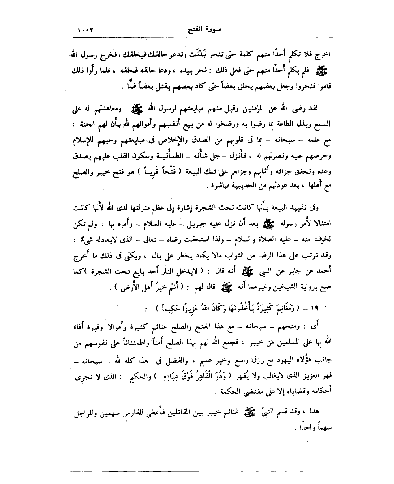 لقد رضي الله عن المؤمنين وقبل منهم مبايعتهم لرسول الله صلى الله عليه وسلم ومعاهدتهم له على السمع وبذل الطاعة بما رضوا به ورضخوا له من بيع أنفسهم وأموالهم لله بأن لهم الجنة، مع علمه - سبحانه - بما في قلوبهم من الصدق والإخلاص في مبايعتهم وحبهم للإسلام وحرصهم عليه ونصرتهم له، فأنزل - جل شأنه - الطمأنينة وسكون القلب عليهم بصدق وعده وتحقق جزائه وأثابهم وجزاهم على تلك البيعة (فتحًا قريبًا) هو فتح خيبر والصلح مع أهلها، بعد عودتهم من الحديبية مباشرة.