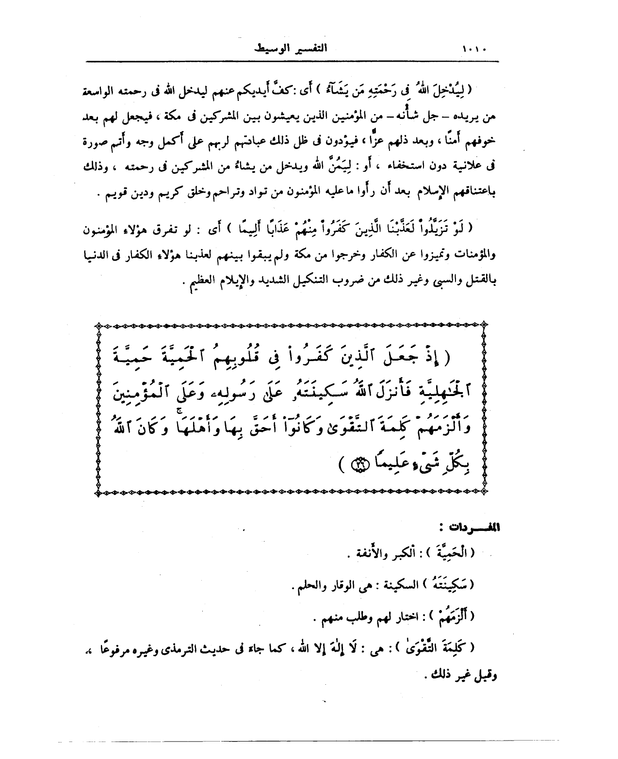 {إِذْ جَعَلَ الَّذِينَ كَفَرُوا في قُلُوبِهِمُ الْحَمِيَّةَ حَمِيَّةَ الْجَاهِلِيَّةِ فَأَنْزَلَ اللهُ سَكِينَتَهُ عَلَى رَسُولِهِ وَعَلَى الْمُؤْمِنِينَ وَأَلْزَمَهُمْ كَلِمَةَ التَّقْوَى وَكَانُوا أَحَقَّ بِهَا وَأَهْلَهَا وَكَانَ اللهُ بِكُلِّ شَيْءٍ عَلِيمًا (26)}