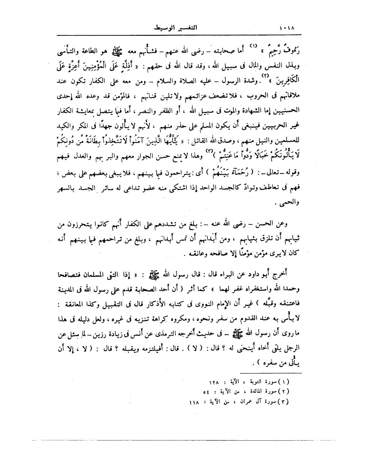 رَءُوفٌ رَحِيمٌ} (¬1) أما صحابته - رضي الله عنهم - فشأنهم معه - صلى الله عليه وسلم - هو الطاعة والتأسي وبذل النفس والمال في سبيل الله، وقد قال الله في حقهم: {أَذِلَّةٍ عَلَى الْمُؤْمِنِينَ أَعِزَّةٍ عَلَى الْكَافِرِينَ} (¬2). وشدة الرسول - عليه الصلاة والسلام - ومن معه على الكفار تكون عند ملاقاتهم في الحروب، فلا تضعف عزائمهم ولا تلين قناتهم، فالمؤمن قد وعده الله إحدى الحسنيين إما الشهادة والموت في سبيل الله، أو الظفر والنصر، أَما فيما يتصل بمعايشة الكفار غير الحربيين فينبغى أن يكون المسلم على حذر منهم؛ لأنهم لا يألون جهدًا في المكر والكيد للمسلمين والنيل منهم، وصدق الله القائل: {يَا أَيُّهَا الَّذِينَ آمَنُوا لَا تَتَّخِذُوا بِطَانَةً مِنْ دُونِكُمْ لَا يَأْلُونَكُمْ خَبَالًا وَدُّوا مَا عَنِتُّمْ} (¬3) وهذا لا يمنع حسن الجوار معهم والبر بهم والعدل فيهم وقوله - تعالى -: (رُحَمَاءُ بَيْنَهُمْ) أي: يتراحمون فيما بينهم، فلا يبغي بعضهم على بعض؛ فهم في تعاطف وتوادّ كالجسد الواحد إذا اشتكى منه عضو تداعى له سائر الجسد بالسهر والحمى.