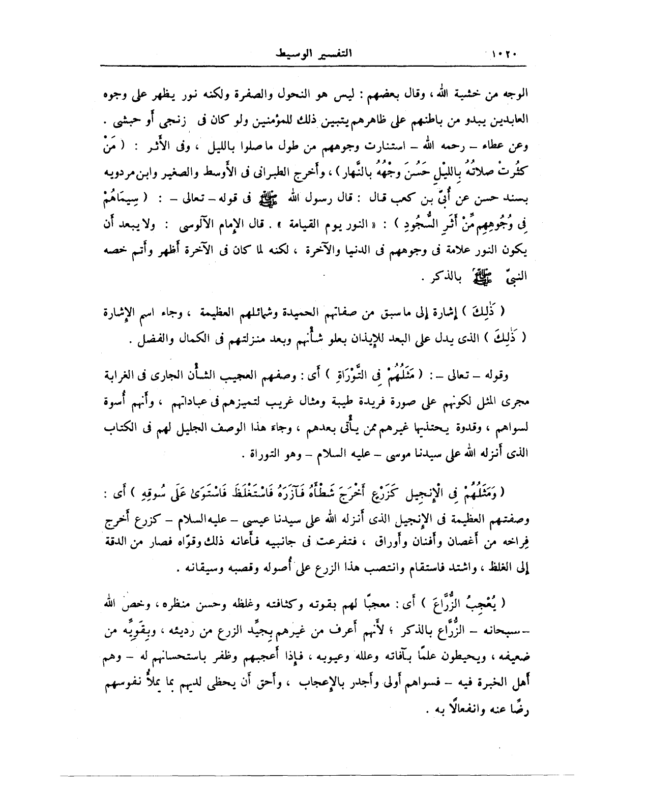 (وَمَثَلُهُمْ في الْإِنْجِيلِ كَزَرْعٍ أَخْرَجَ شَطْأَهُ فَآزَرَهُ فَاسْتَغْلَظَ فَاسْتَوَى عَلَى سُوقِهِ) أي: وصفتهم العظيمة في الإنجيل الذي أنزله الله على سيدنا عيسى - عليه السلام - كزرع أَخرج فِراخه من أَغصان وأَفنان وأَوراق، فتفرعت في جانبيه فأعانه ذلك وقوّاه فصار من الدقة إلى الغلظ، واشتد فاستقام وانتصب هذا الزرع على أصوله وقصبه وسيقانه.