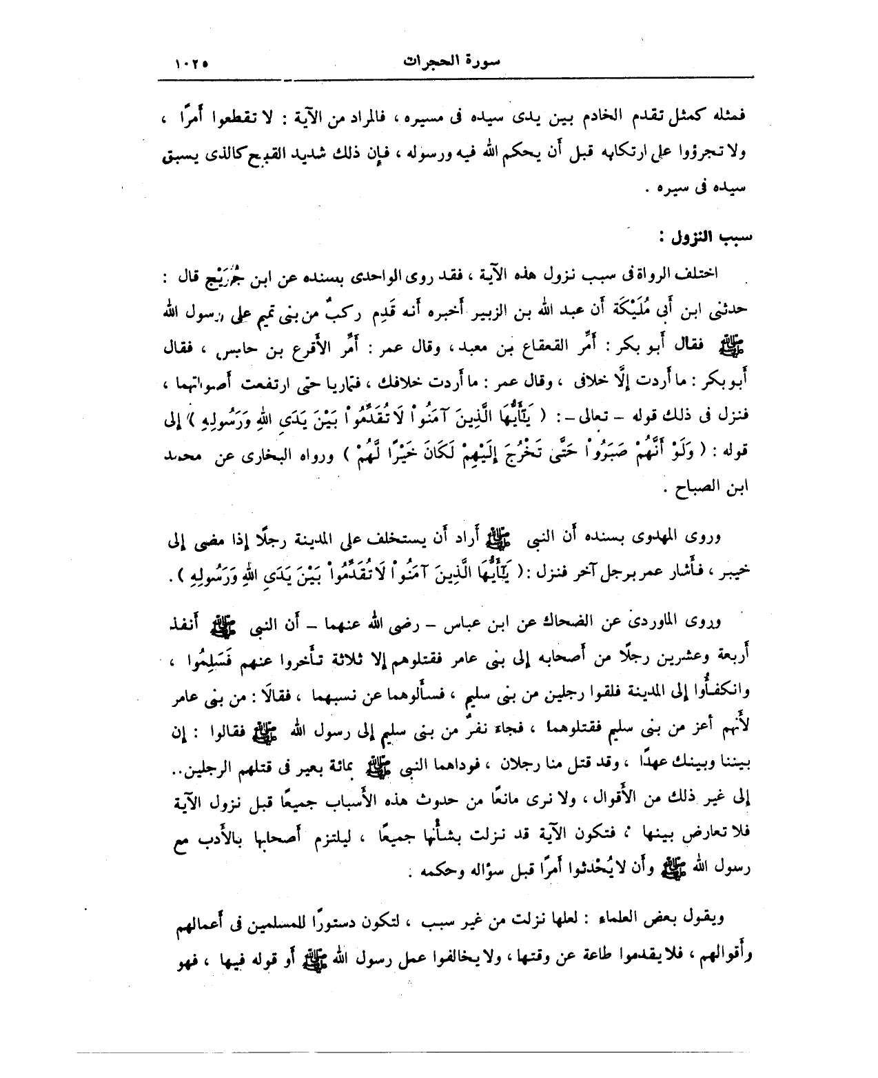 وروى الماوردى عن الضحاك عن ابن عباس - رضي الله عنهما - أن النبي صلى الله عليه وسلم أنفد أربعة وعشرين رجلًا من أصحابه إلى بني عامر فقتلوهم إلا ثلاثة تأخروا عنهم فسَلمُوا، وانكفأوا إلى المدينة فلقوا رجلين من بني سليم، فسألوهما عن نسبهما، فقالاَ: من بني عامر لأنهم أعز من بني سليم فقتلوهما، فجاء نفرٌ من بني سليم إلى رسول الله صلى الله عليه وسلم فقالوا: إن بيننا وبينك عهدًا، وقد قتل منا رجلان، فوداهما النبي - صلى الله عليه وسلم - بمائة بعير في قتلهم الرجلين .. إلى غير ذلك من الأقوال، ولا نرى مانعًا من حدوث هذه الأسباب جميعًا قبل نزول الآية فلا تعارض بينها، فتكون الآية قد نزلت بشأنها جميعًا، ليلتزم أصحابها بالأدب مع رسول الله صلى الله عليه وسلم وأن لا يُحْدثوا أمرًا قبل سؤاله وحكمه.