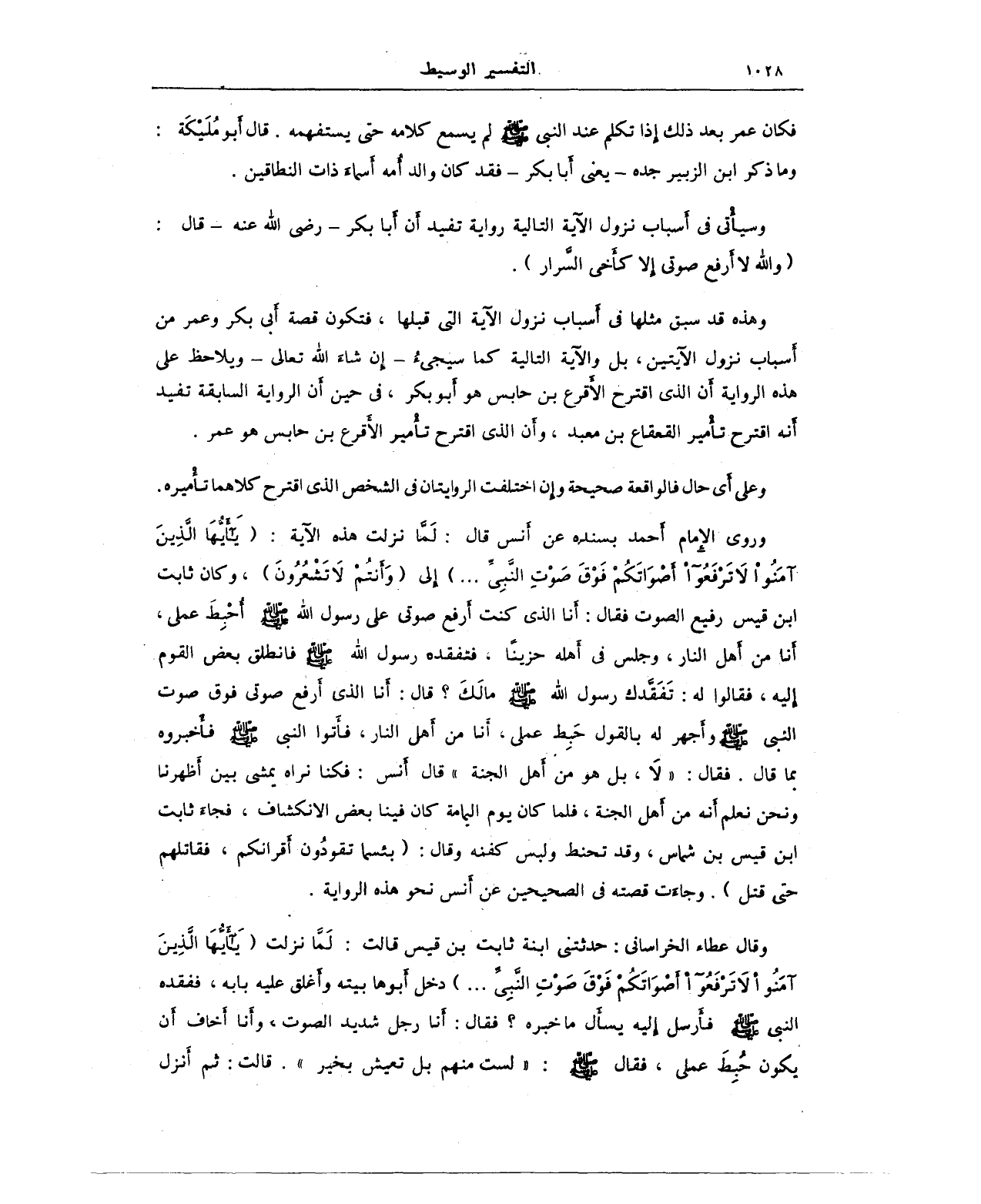 وروى الإِمام أحمد بسنده عن أنس قال: لمَّا نزلت هذه الآية: (يَا أَيُّهَا الَّذِينَ آمَنُوا لَا تَرْفَعُوا أَصْوَاتَكُمْ فَوْقَ صَوْتِ النَّبِيِّ ... ) إلى (وَأَنْتُمْ لَا تَشْعُرُونَ)، وكان ثابت ابن قيس رفيع الصوت فقال: أنا الذي كنت أرفع صوتي على رسول الله صلى الله عليه وسلم أُحْبِطَ عملي، أنا من أهل النار، وجلس في أهله حزينًا، فتفقده رسول الله صلى الله عليه وسلم فانطلق بعض القوم إليه، فقالوا له: تفقَّدك رسول الله صلى الله عليه وسلم مالَكَ؟ قال: أنا الذي أرفع صوق فوق صوت النبي صلى الله عليه وسلم وأجهر له بالقول حَبِط عملي، أنا من أهل النار، فأتوا النبي صلى الله عليه وسلم فأخبروه بما قال. فقال: "لا، بل هو من أهل الجنة" قال أنس: فكنا نراه يمشي بين أظهرنا ونحن نعلم أنه من أهل الجنة، فلما كان يوم اليمامة كان فينا بعض الانكشاف، فجاء ثابت ابن قيس بن شماس، وقد تحنط ولبس كفنه وقال: (بئسما تقودُون أقرانكم، فقاتلهم حتى قتل). وجاءت قصته في الصحيحين عن أنس نحو هذه الرواية.