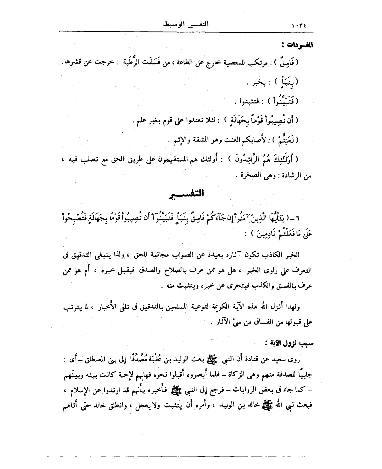 6 - (يَا أَيُّهَا الَّذِينَ آمَنُوا إِنْ جَاءَكُمْ فَاسِقٌ بِنَبَإٍ فَتَبَيَّنُوا أَنْ تُصِيبُوا قَوْمًا بِجَهَالَةٍ فَتُصْبِحُوا عَلَى مَا فَعَلْتُمْ نَادِمِينَ):