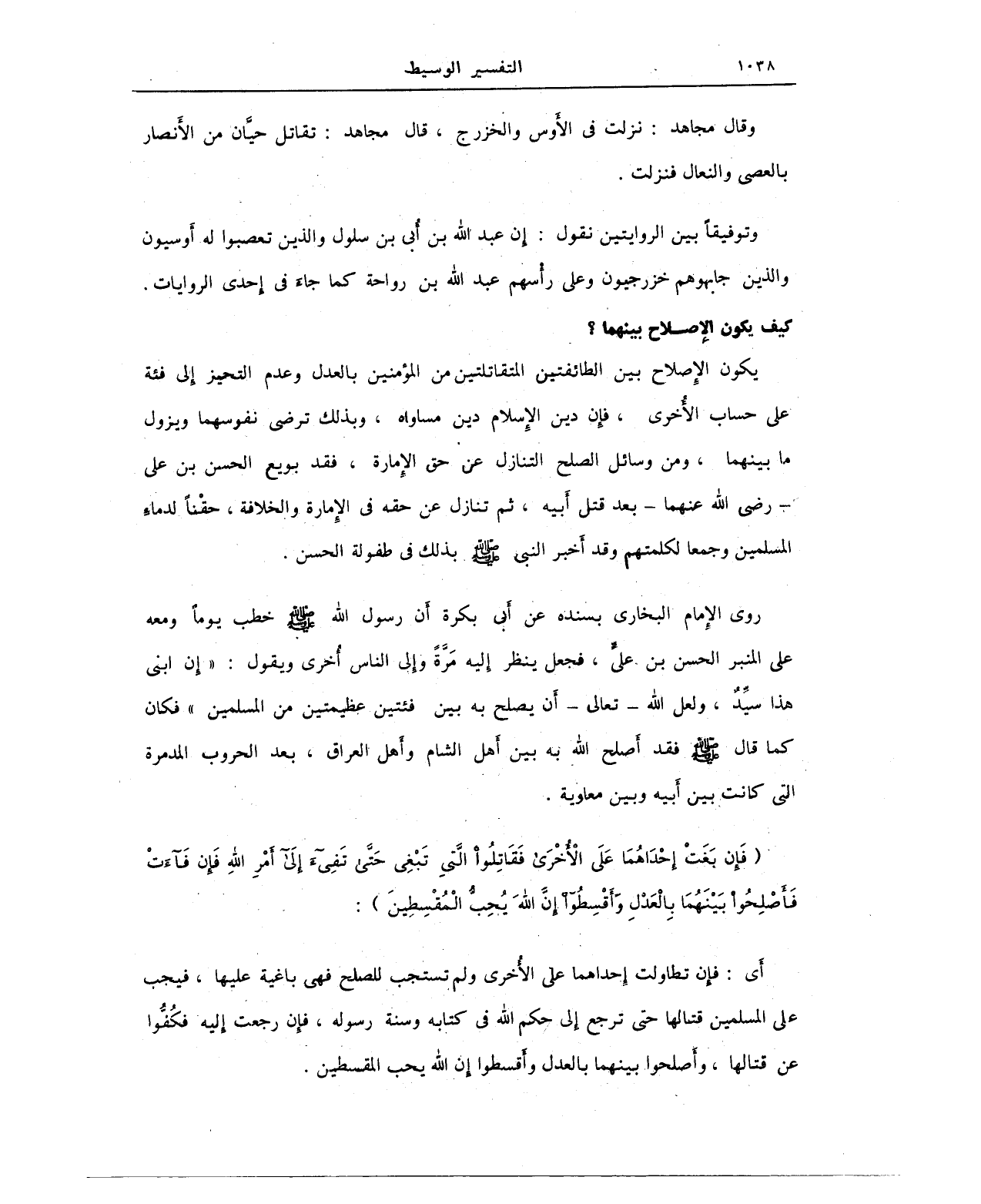 (فَإِنْ بَغَتْ إِحْدَاهُمَا عَلَى الْأُخْرَى فَقَاتِلُوا الَّتِي تَبْغِي حَتَّى تَفِيءَ إِلَى أَمْرِ اللهِ فَإِنْ فَاءَتْ فَأَصْلِحُوا بَيْنَهُمَا بِالْعَدْلِ وَأَقْسِطُوا إِنَّ اللهَ يُحِبُّ الْمُقْسِطِينَ):