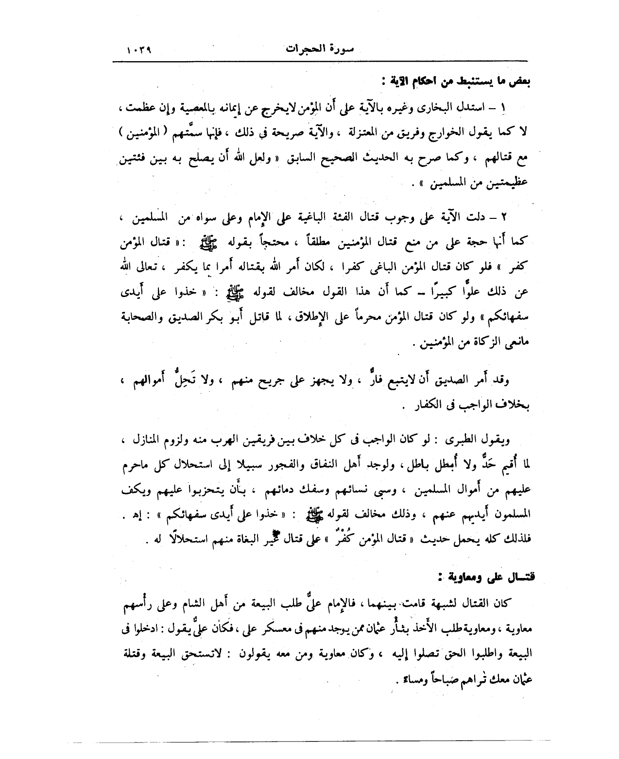 2 - دلت الآية على وجوب قتال الفئة الباغية على الإِمام وعلى سواه من المسلمين، كما أنها حجة على من منع قتال المؤمنين مطلقًا، محتجًا بقوله - صلى الله عليه وسلم -: "قتال المؤمن كفر" فلو كان قتال المؤمن الباغى كفرًا، لكان أمر الله بقتاله أمرا بما يكفر، تعالى الله عن ذلك علوًّا كبيرًا - كما أن هذا أقول مخالف لقوله - صلى الله عليه وسلم -: "خذوا على أيدى سفائكم" ولو كان قتال المؤمن محرمًا على الإطلاق، لما قاتل أبو بكر الصديق والصحابة مانعى الزكاة من المؤمنين.