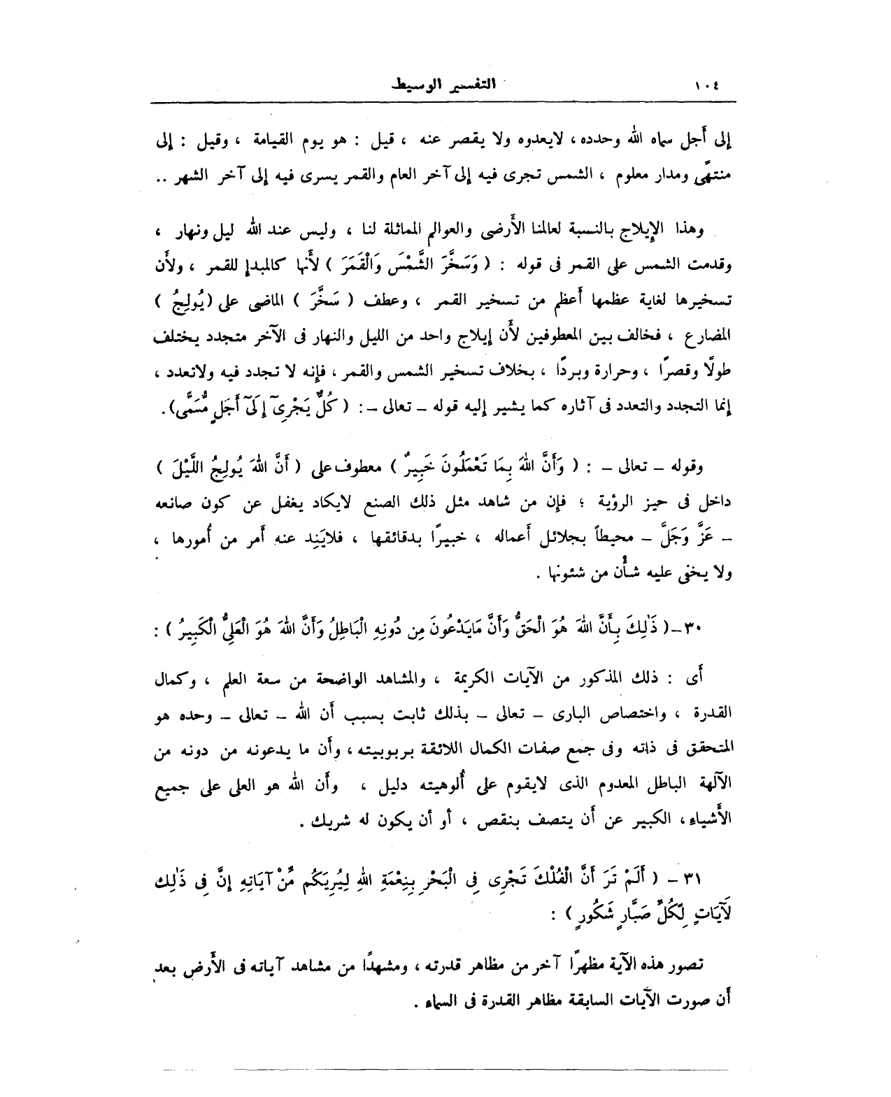 وهذا الإيلاج بالنسبة لعالمنا الأرضي والعوالم المماثلة لنا، وليس عند الله ليل ونهار، وقدمت الشمس على القمر في قوله: {وَسَخَّرَ الشَّمْسَ وَالْقَمَرَ} لأنها كالمبدإ للقمر، ولأن تسخيرها لغاية عظمها أعظم من تسخير القمر، وعطف {سَخَّرَ} الماضي على {يُولِجُ} المضارع، فخالف بين المعطوفين لأن إيلاج واحد من الليل والنهار في الآخر متجدد يختلف طولًا وقصرًا، وحرارة وبردًا، بخلاف تسخير الشمس والقمر، فإنه لا تجدد فيه ولا تعدد، إنما التجدد والتعدد في آثاره كما يشير إليه قوله - تعالى -: {كُلٌّ يَجْرِي إِلَى أَجَلٍ مُسَمًّى}.