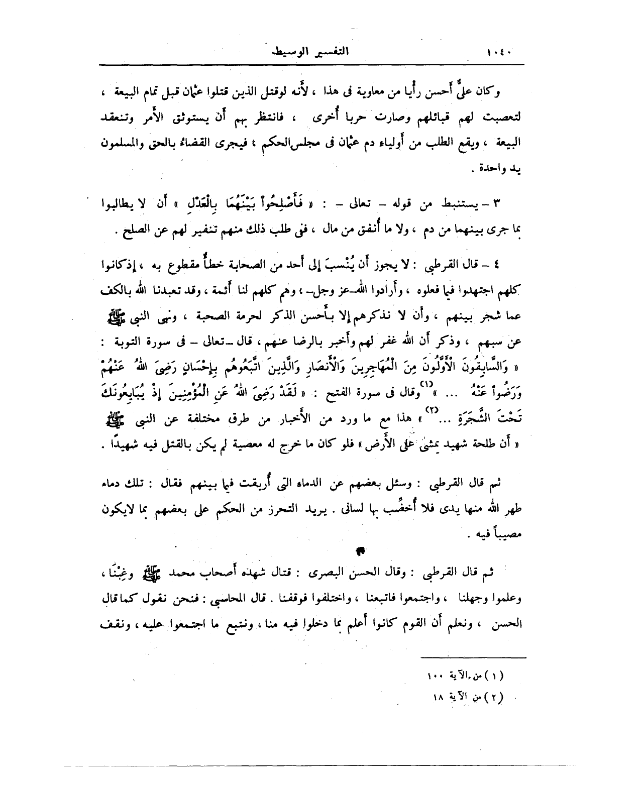 4 - قال القرطبي: لا يجوز أن يُنْسبَ إلى أحد من الصحابة خطأٌ مقطوع به، إذ كانوا كلهم اجتهدوا فيما فعلوه، وأرادوا الله - عَزَّ وَجَلَّ -، وهم كلهم لنا أئمة، وقد تعبدنا الله بالكف عما شجر بينهم، وأن لا نذكرهم إلا بأحسن الذكر لحرمة الصحبة، ونهي النبي - صلى الله عليه وسلم - عن سبهم، وذكر أن الله غفر لهم وأخبر بالرضا عنهم، قال - تعالى - في سورة التوبة: {وَالسَّابِقُونَ الْأَوَّلُونَ مِنَ الْمُهَاجِرِينَ وَالْأَنْصَارِ وَالَّذِينَ اتَّبَعُوهُمْ بِإِحْسَانٍ رَضِيَ اللهُ عَنْهُمْ وَرَضُوا عَنْهُ ... } (¬1) وقال في سورة الفتح: {لَقَدْ رَضِيَ اللهُ عَنِ الْمُؤْمِنِينَ إِذْ يُبَايِعُونَكَ تَحْتَ الشَّجَرَةِ ... } (¬2) هذا مع ما ورد من الأخبار من طرق مختلفة عن النبي - صلى الله عليه وسلم - "أن طلحة شهيد يمشي على الأرض" فلو كان ما خرج له معصية لم يكن بالقتل فيه شهيدًا.