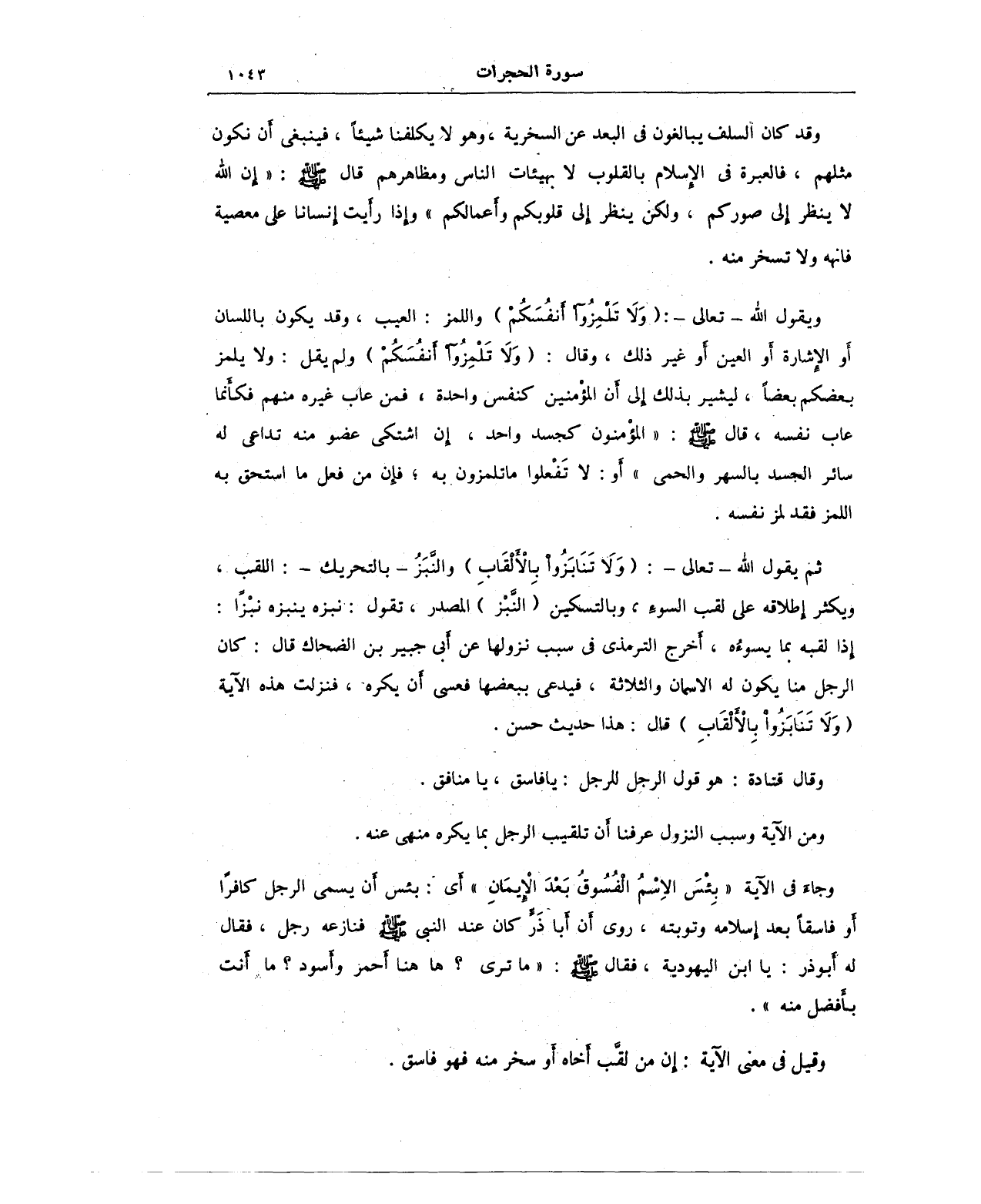ثم يقول الله - تعالى -: (وَلَا تَنَابَزُوا بِالْأَلْقَابِ) والنَّبَزُ - بالتحريك -: اللقب، ويكثر إطلاقه على لقب السوء، وبالتسكين (النَّبْزُ) المصدر، تقول: نبزه ينبز نبزًا: إذا لقبه بما يسوءُه، أخرج الترمذي في سبب نزولها عن أبي جبير بن الضحاك قال: كان الرجل منا يكون له الاسمان والثلاثة، فيدعى ببعضها فعسى أن يكره، فنزلت هذه الآية (وَلَا تَنَابَزُوا بِالْأَلْقَابِ) قال: هذا حديث حسن.