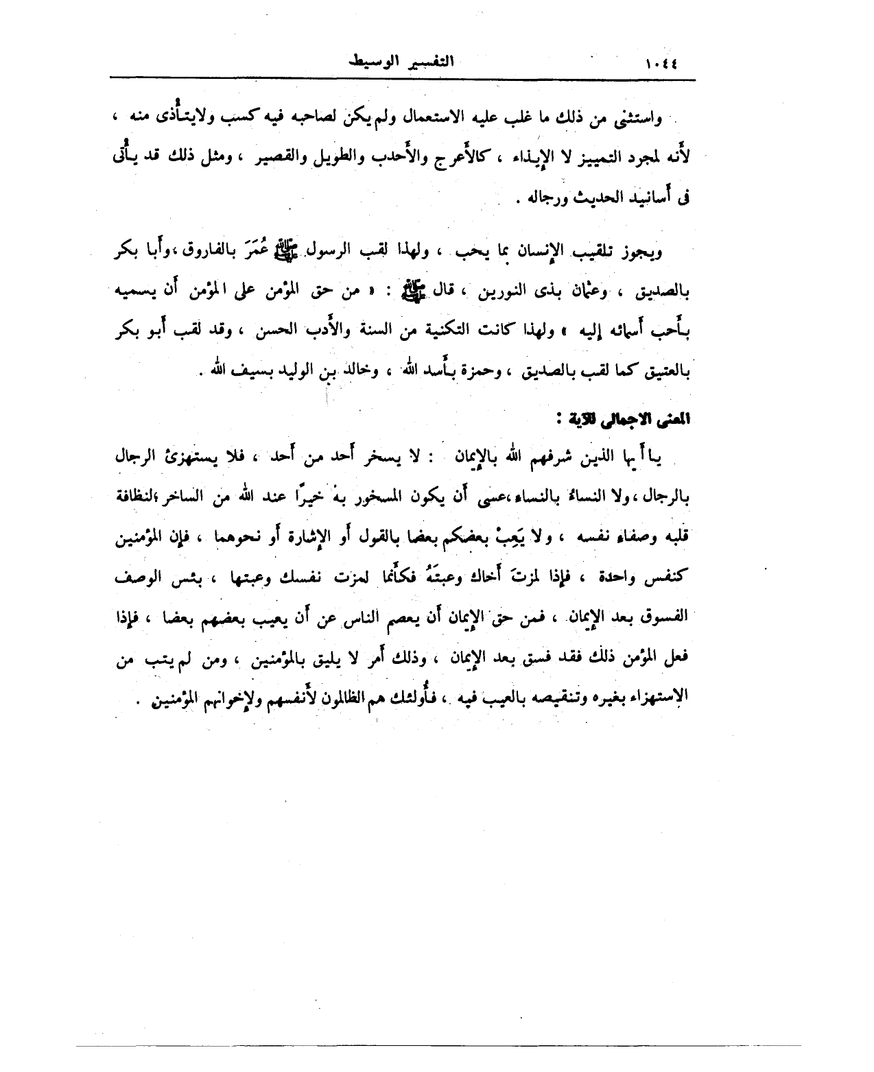 يا أيها الذين شرفهم الله بالإيمان: لا يسخر أحد من أحد، فلا يستهزئ الرجال بالرجال، ولا النساءُ بالنساء، عسى أن يكون المسخور به خيرًا عند الله من الساخر؛ لنظافة قلبه وصفاءِ نفسه، ولا يَعِبْ بعضكم بعضا بالقول أو الإشارة أو نحوهما، فإن المؤمنين كنفس واحدة، فإذا لمزتَ أخاك وعبتهُ فكأنَّما لمزت نفسك وعبتها، بئس الوصف الفسوق بعد الإيمان، فمن حق الإيمان أن يعصم الناس عن أن يعيب بعضهم بعضا، فإذا فعل المؤمن ذلك فقد فسق بعد الإيمان، وذلك أمر لا يليق بالمؤمنين، ومن لم يتب من الاستهزاء بغيره وتنقيصه بالعيب فيه، فأولئك هم الظالمون لأنفسم ولإخوانهم المؤمنين.