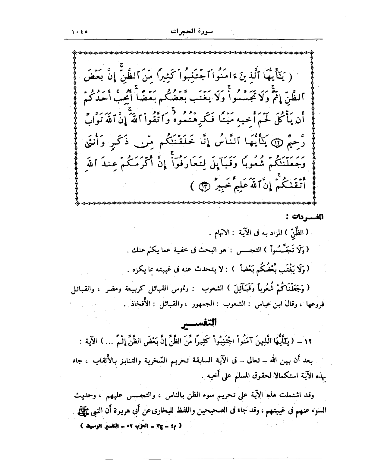 (يَا أَيُّهَا الَّذِينَ آمَنُوا اجْتَنِبُوا كَثِيرًا مِنَ الظَّنِّ إِنَّ بَعْضَ الظَّنِّ إِثْمٌ وَلَا تَجَسَّسُوا وَلَا يَغْتَبْ بَعْضُكُمْ بَعْضًا أَيُحِبُّ أَحَدُكُمْ أَنْ يَأْكُلَ لَحْمَ أَخِيهِ مَيْتًا فَكَرِهْتُمُوهُ وَاتَّقُوا اللهَ إِنَّ اللهَ تَوَّابٌ رَحِيمٌ (12) يَا أَيُّهَا النَّاسُ إِنَّا خَلَقْنَاكُمْ مِنْ ذَكَرٍ وَأُنْثَى وَجَعَلْنَاكُمْ شُعُوبًا وَقَبَائِلَ لِتَعَارَفُوا إِنَّ أَكْرَمَكُمْ عِنْدَ اللهِ أَتْقَاكُمْ إِنَّ اللهَ عَلِيمٌ خَبِيرٌ (13))