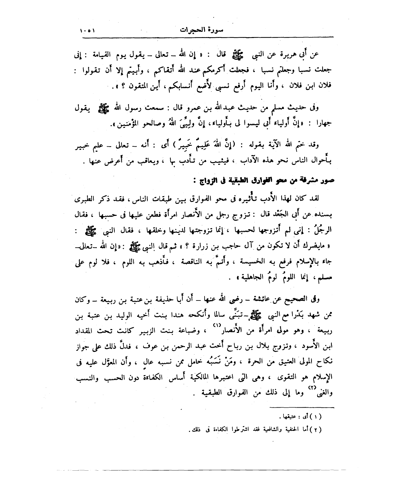وفي الصحيح عن عائشة - رضي الله عنها - أن أبا حذيفة بن عتبة بن ربيعة - وكان ممن شهد بدرًا مع النبي - صلى الله عليه وسلم - تبَنَّى سالما وأنكحه هند بنت أخيه الوليد بن عتبة بن ربيعة، وهو مولى امرأة من الأنصار (¬1)، وضباعة بنت الزبير كانت تحت المقداد ابن الأَسود، وتزوج بلال بن رباح أخت عبد الرحمن بن عوف، فدل ذلك على جواز نكاح المولى العتق من الحرة، ومَنْ نَسَبُه خامل ممن نسبه عالٍ، وأن المعوّل عليه في الإِسلام هو التقوى، وهي التي اعتبرها المالكية أساس الكفاءَة كون الحسب والنسب والغنى (¬2) وما إلى ذلك من الفوارق الطبقية.