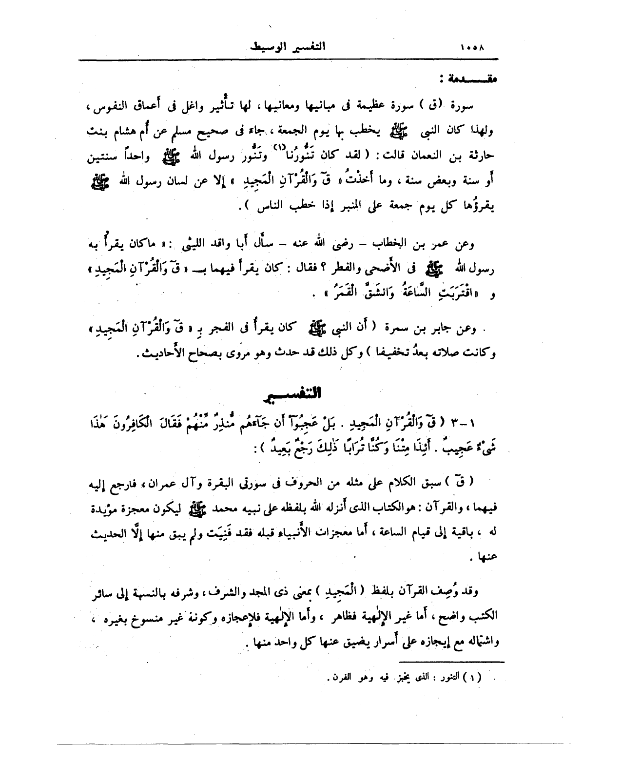 (ق) سبق الكلام على مثله من الحروف في سورتي البقرة وآل عمران، فارجع إليه فيهما، والقرآن: هو الكتاب الذي أنزله الله بلفظه على نبيه محمَّد - صلى الله عليه وسلم - ليكون معجزة مؤيدة له، باقية إلى قيام الساعة، أما معجزات الأنبياء قبله فقد فَنِيَت ولم يبق منها إلاَّ الحديث عنها.