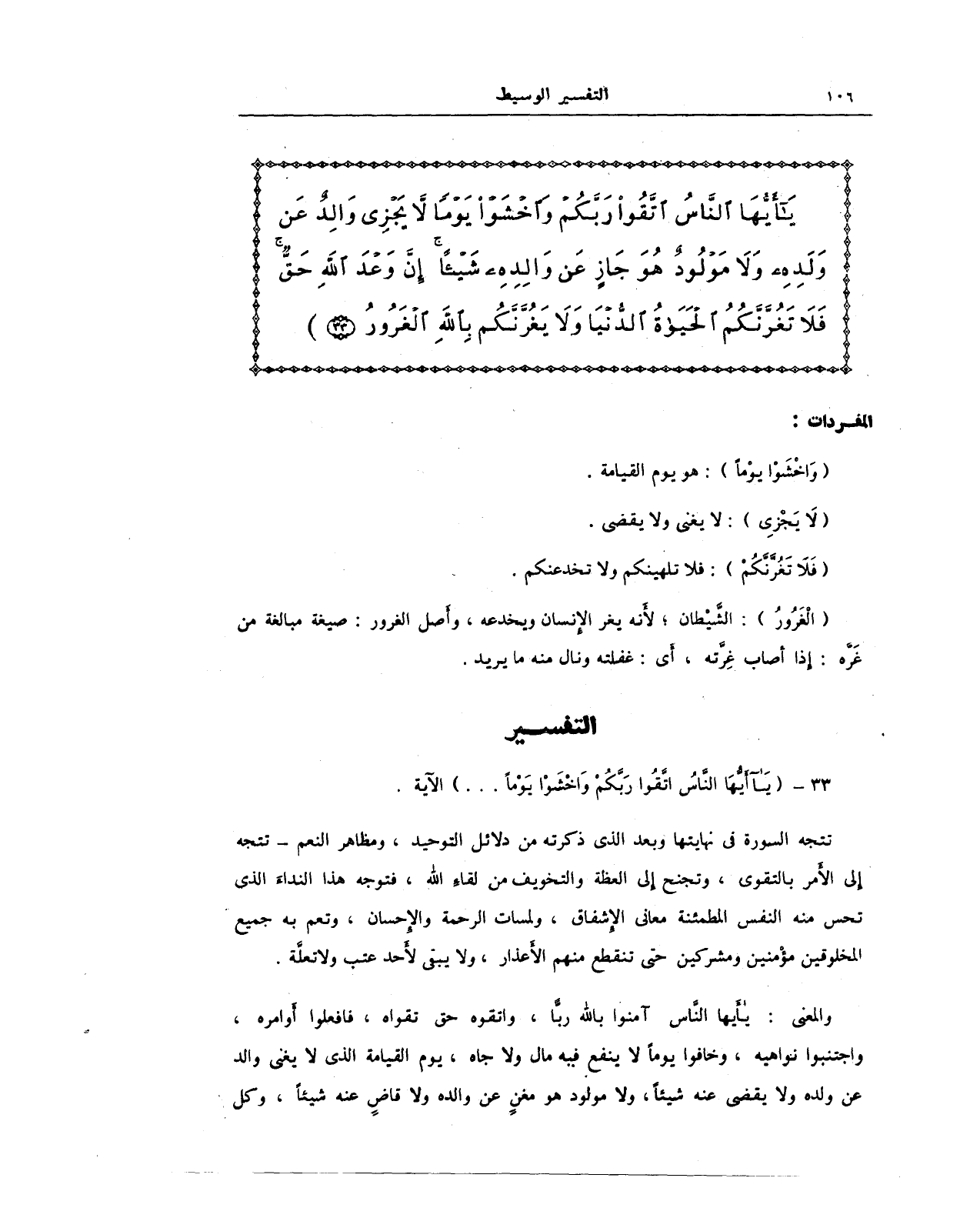 {يَا أَيُّهَا النَّاسُ اتَّقُوا رَبَّكُمْ وَاخْشَوْا يَوْمًا لَا يَجْزِي وَالِدٌ عَنْ وَلَدِهِ وَلَا مَوْلُودٌ هُوَ جَازٍ عَنْ وَالِدِهِ شَيْئًا إِنَّ وَعْدَ اللَّهِ حَقٌّ فَلَا تَغُرَّنَّكُمُ الْحَيَاةُ الدُّنْيَا وَلَا يَغُرَّنَّكُمْ بِاللَّهِ الْغَرُورُ (33)}
